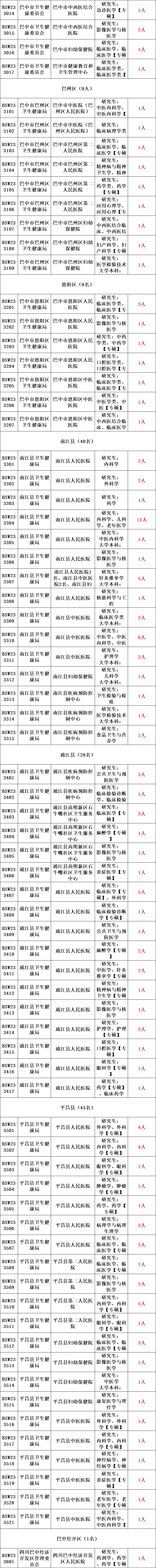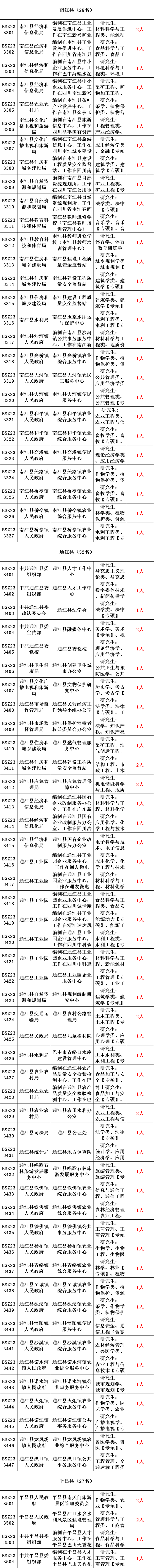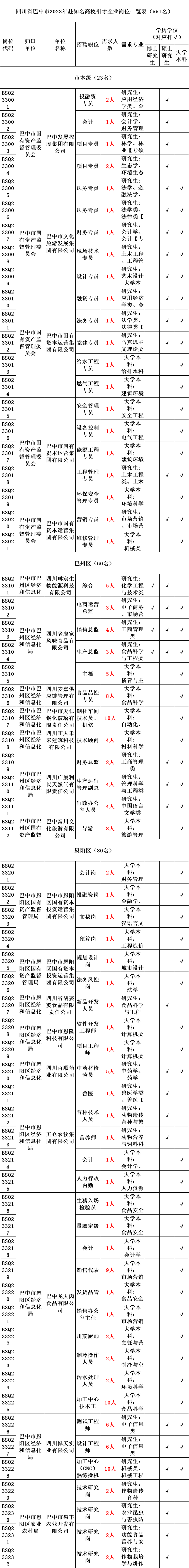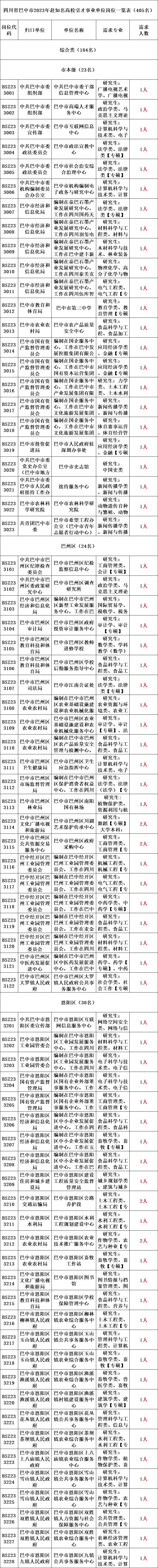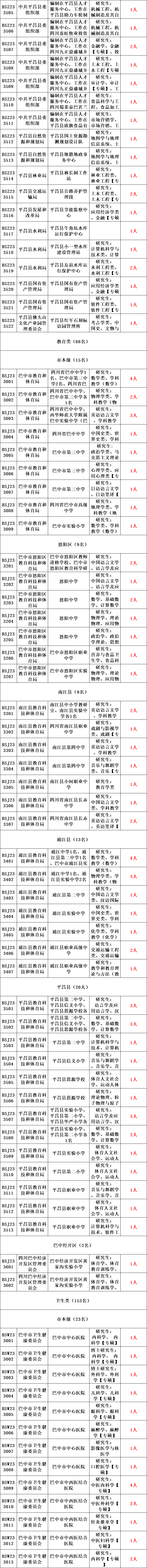 具体岗位及要求请登录巴中党建网查询《四川省巴中市2023年赴知名高校引才事业单位岗位一览表》(附件2)