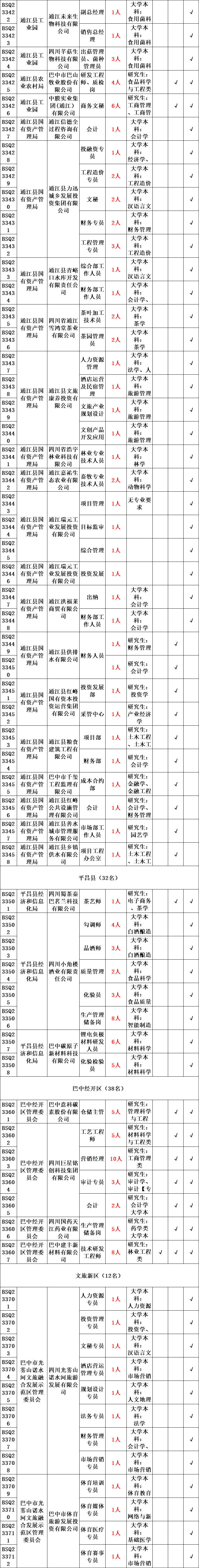 事业单位共引进编制内人才405名。其中,综合类岗位184名:市本级23名、巴州区24名、恩阳区30名、南江县28名、通江县52名、平昌县27名;教育类岗位68名:市本级15名、恩阳区9名、南江县9名、通江县13名、平昌县20名、巴中经开区2名;卫生类岗位153名:市本级23名、巴州区9名、恩阳区9名、南江县40名、通江县28名、平昌县43名、巴中经开区1名。
