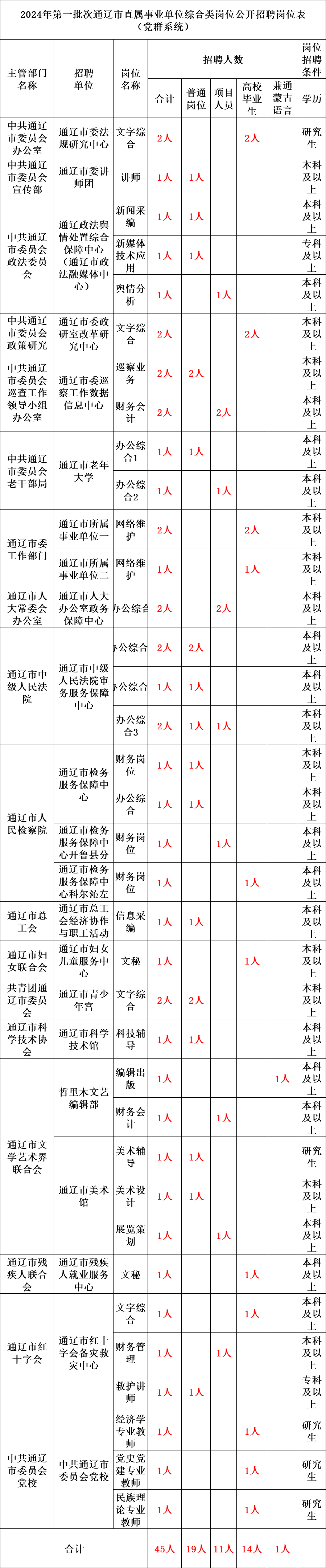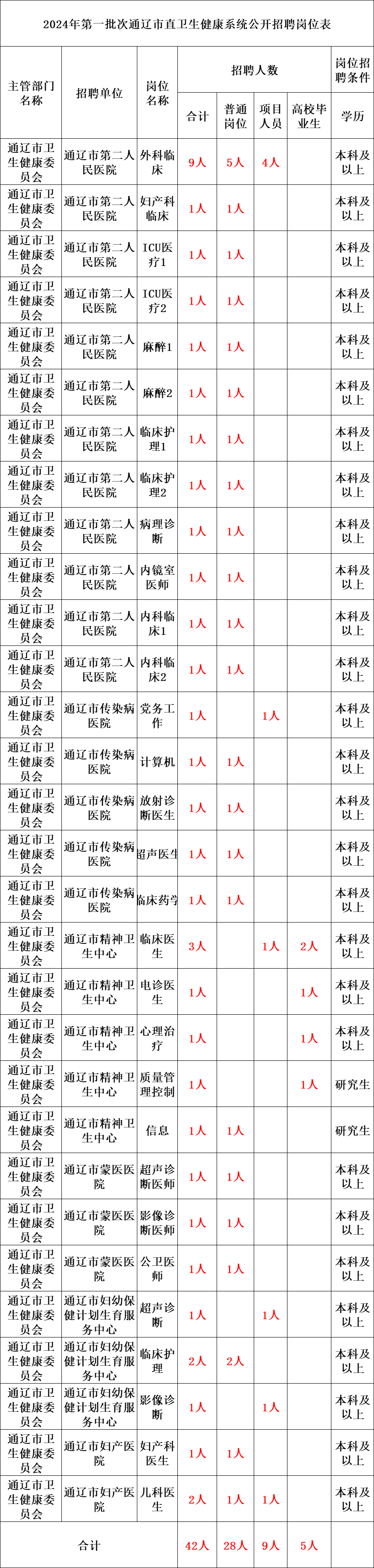 根据《内蒙古自治区事业单位公开招聘人员办法》(内人社发﹝2022﹞2号)、《关于提前启动2024年全区事业单位公开招聘工作的通知》(内人社发﹝2023﹞58号)和用人单位实际需求,经研究决定,提前启动2024年第一批次通辽市直属事业单位公开招聘工作,现就公开招聘有关事宜公告如下: