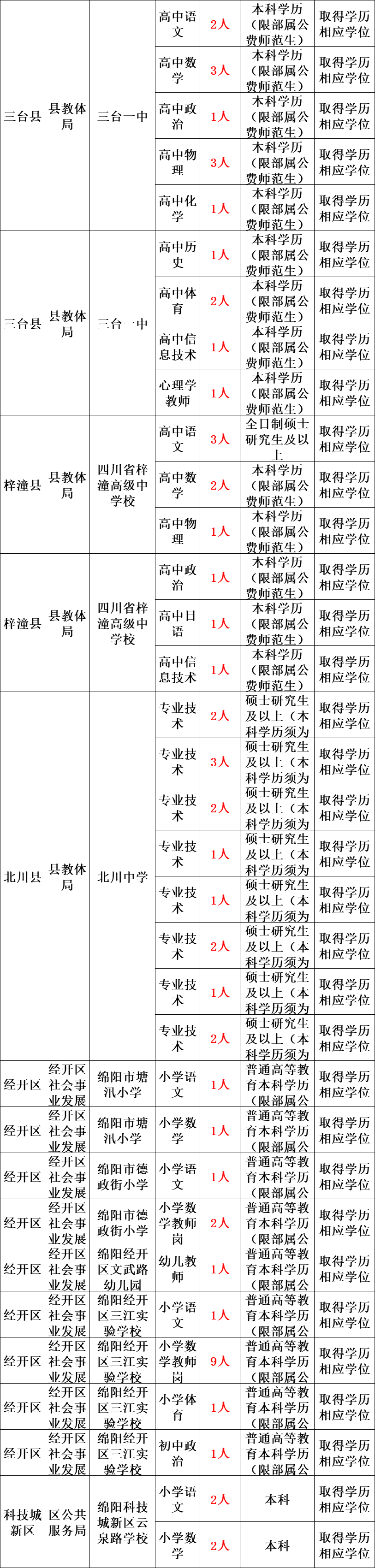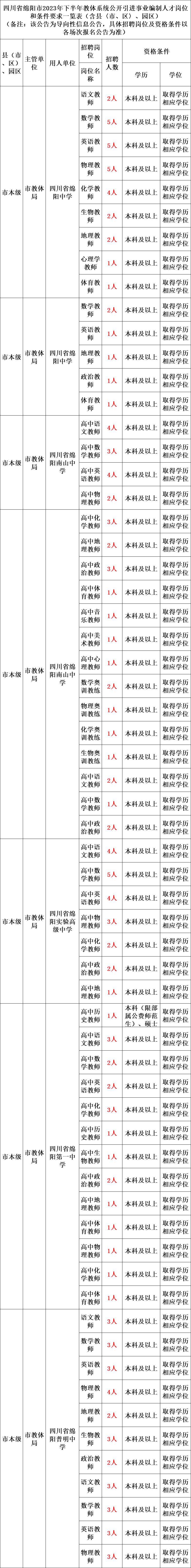 (三)绵阳市教体、卫健系统拟公开引进事业编制人才960名,其中教体系统引进人才462名(详见附件3),卫健系统引进人才498名(详见附件4)。