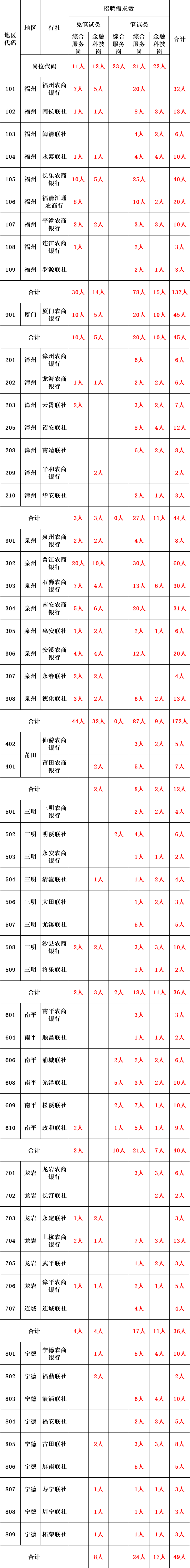 2024年福建农信新员工招聘分为免笔试类、普通笔试类。其中免笔试类、普通笔试类两个类别均设置综合服务岗位、金融科技岗位(金融科技岗位限计算机相关相近专业人员报考,各行社招聘岗位需求详见分布表)。
