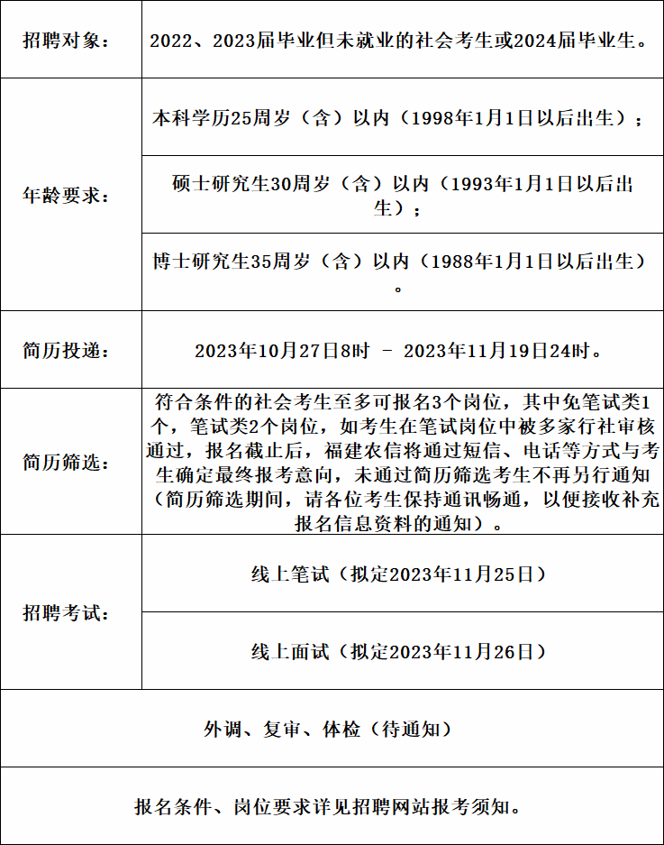 符合条件的社会考生至多可报名3个岗位,其中免笔试类1个,笔试类2个岗位,如考生在笔试岗位中被多家行社审核通过,报名截止后,福建农信将通过短信、电话等方式与考生确定最终报考意向,未通过简历筛选考生不再另行通知(简历筛选期间,请各位考生保持通讯畅通,以便接收补充报名信息资料的通知)。