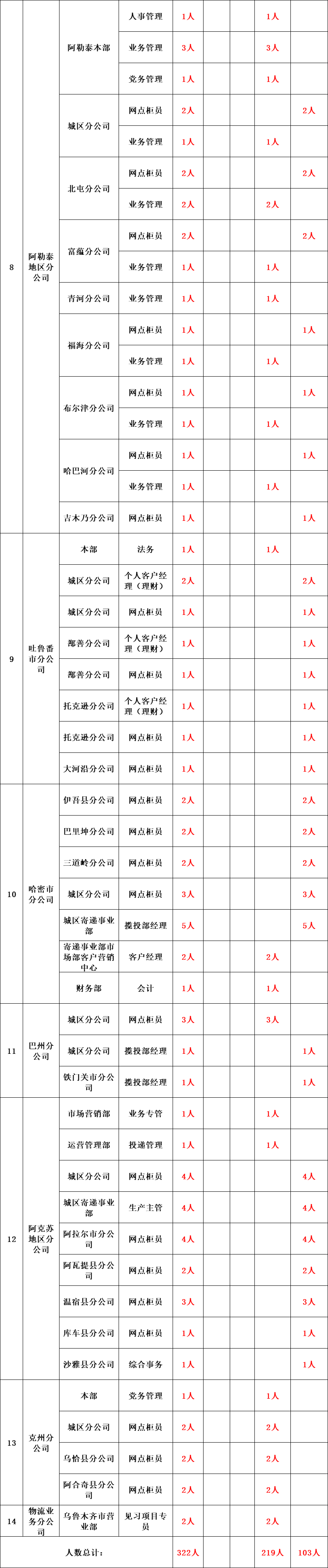 中国邮政集团有限公司新疆维吾尔自治区分公司,是中国邮政集团有限公司在新疆行政区域范围内设立的省级公司,主要负责区内邮政通信网的建设、运行、经营与管理,受政府委托承担普遍服务和特殊服务义务。下辖16个地州(市)分公司、87个县(市、区)分公司、1500余个营业网点。现就辖区内分公司开展校园招聘工作,诚招各类人才和优秀毕业生的加入,携手共创新疆邮政美好未来!