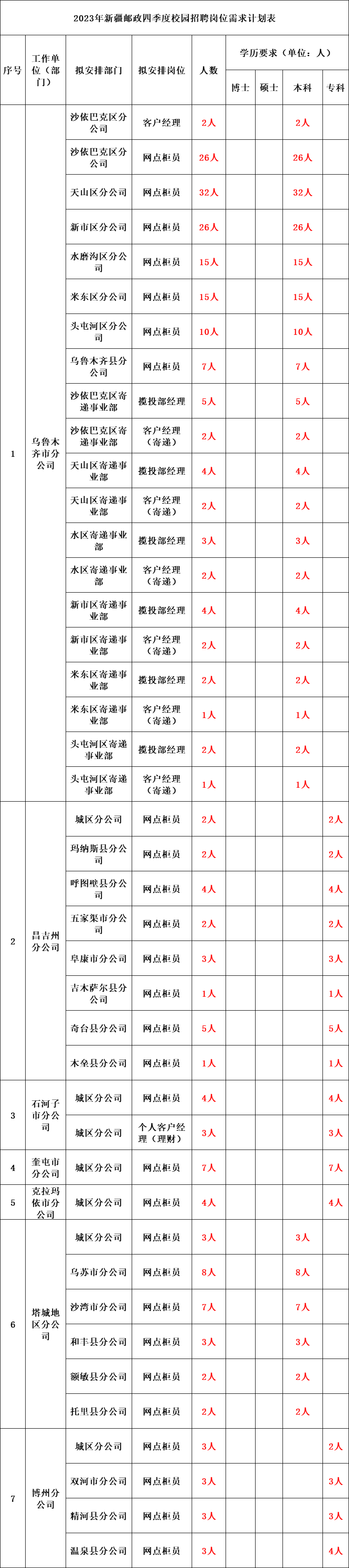 具体招聘岗位详见附件一《2023年中国邮政集团有限公司新疆维吾尔自治区分公司四季度校园招聘职位表》。