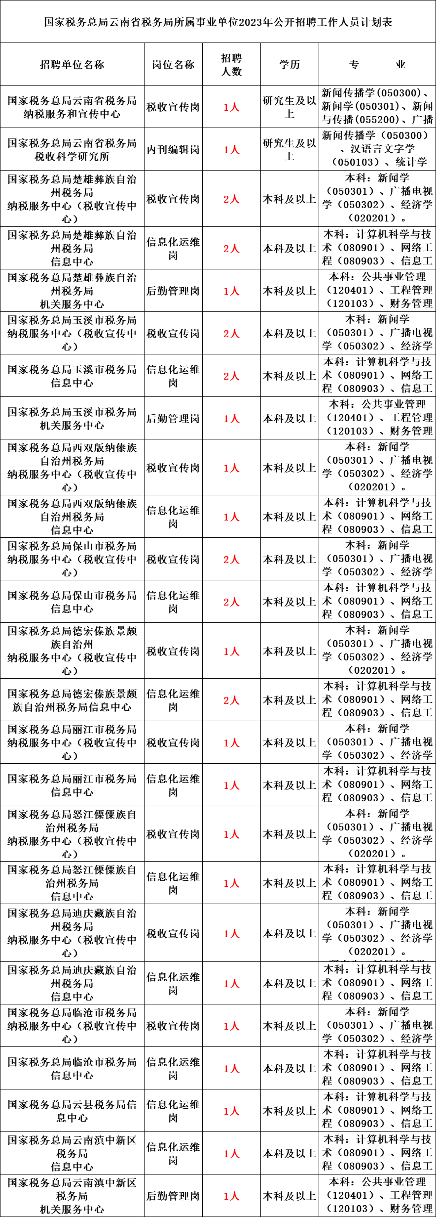 具体招聘岗位及要求见附表《国家税务总局云南省税务局所属事业单位2023年公开招聘工作人员计划表》。