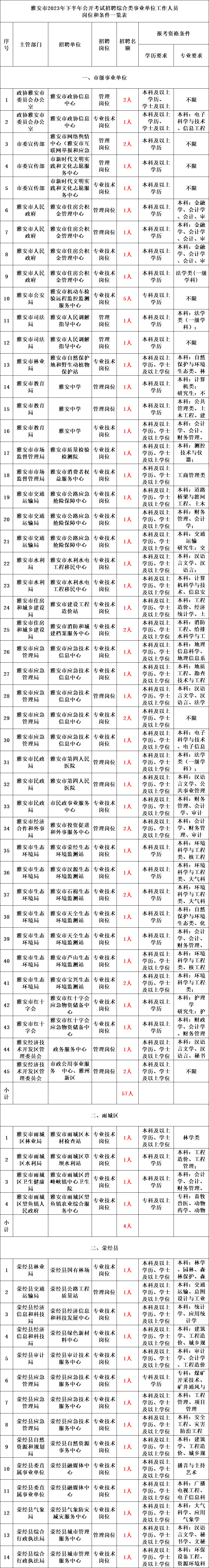 本次公开招聘综合类事业单位工作人员名额共计213名,具体招聘单位、岗位、名额及报考资格条件详见《雅安市2023年下半年公开考试招聘综合类事业单位工作人员岗位和条件一览表》。