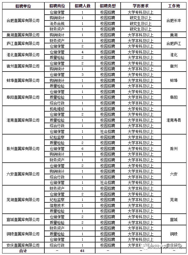 本次招聘为中储粮安徽分公司辖区直属企业岗位,其中校园招聘计划招聘59人,面向按时毕业并取得相应学历学位的普通高等学校2024年应届毕业生;社会招聘计划招聘2人,面向社会工作人员。招聘单位、岗位、人数及工作地见下表。详细信息见公告附件:《2024年度招聘岗位需求计划表》。