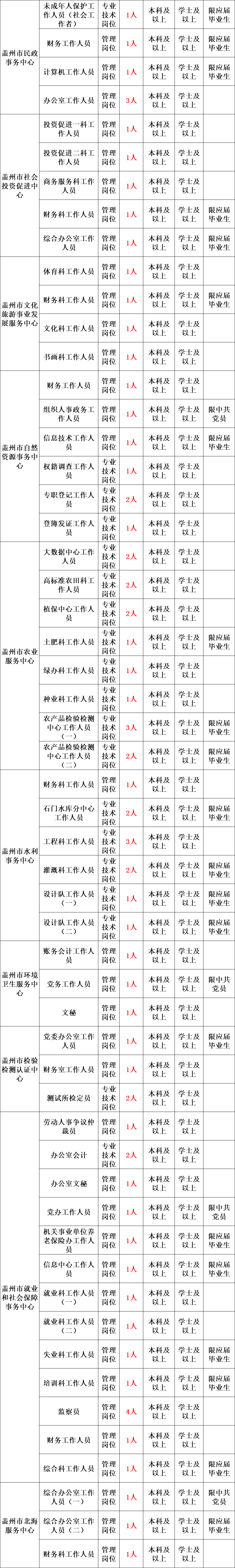 4.其他:岗位所需的其他条件见《2023年盖州市公开招聘事业单位工作人员岗位信息表》。报考专业技术岗位的录用人员须在两年内取得专业技术资格。招聘岗位条件中标明“限应届毕业生”的岗位,指2023年应届高校毕业生和择业期内(2021年、2022年毕业)未落实工作单位的高校毕业生,其他人员不能报考。择业期内未落实工作单位的高校毕业生是指国家统一招生的普通高校毕业生离校时和在国家规定的择业期内未落实工作单位,其户口、档案、组织关系仍保留在原毕业学校,或保留在各级毕业生就业主管部门(毕业生就业指导服务中心)、各级人才交流服务机构和各级公共就业服务机构的毕业生。招聘岗位条件中标明限营口市“三支一扶”人员,指服务期满考核合格的营口地区“三支一扶”人员,其他人员不能报考。