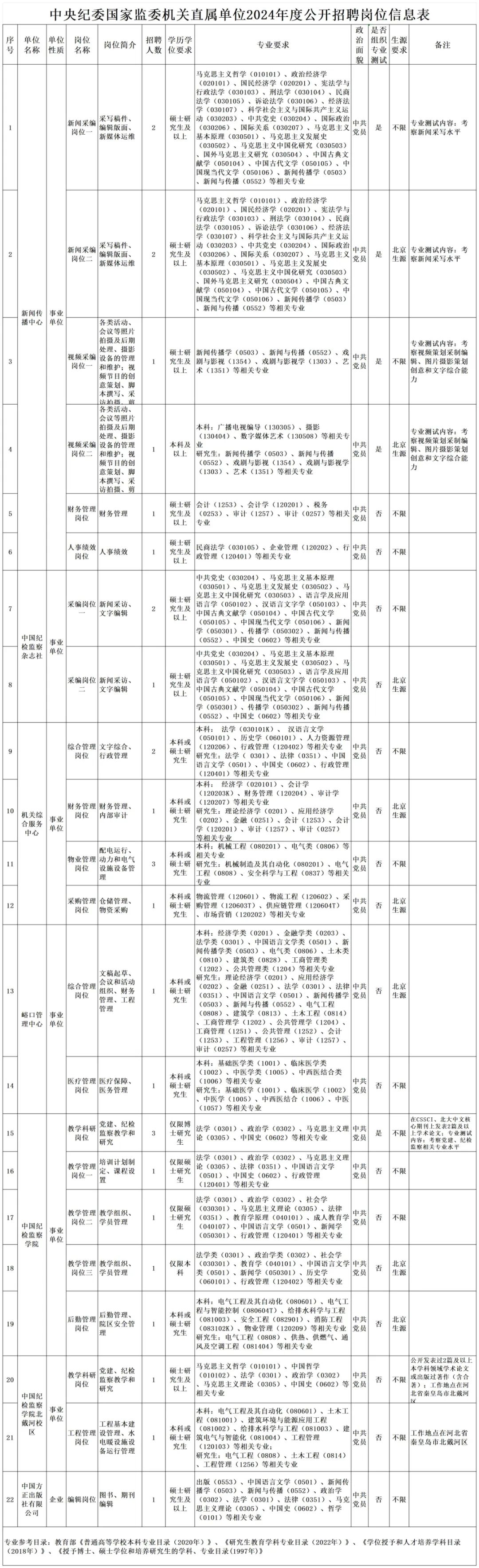 根据工作需要,按照《事业单位人事管理条例》和事业单位公开招聘有关政策规定,中央纪委国家监委新闻传播中心、中国纪检监察杂志社、中央纪委国家监委机关综合服务中心、中央纪委国家监委峪口管理中心、中国纪检监察学院、中国纪检监察学院北戴河校区、中国方正出版社有限公司等7家单位2024年度面向应届高校毕业生公开招聘工作人员30名。现将有关事项公告如下。