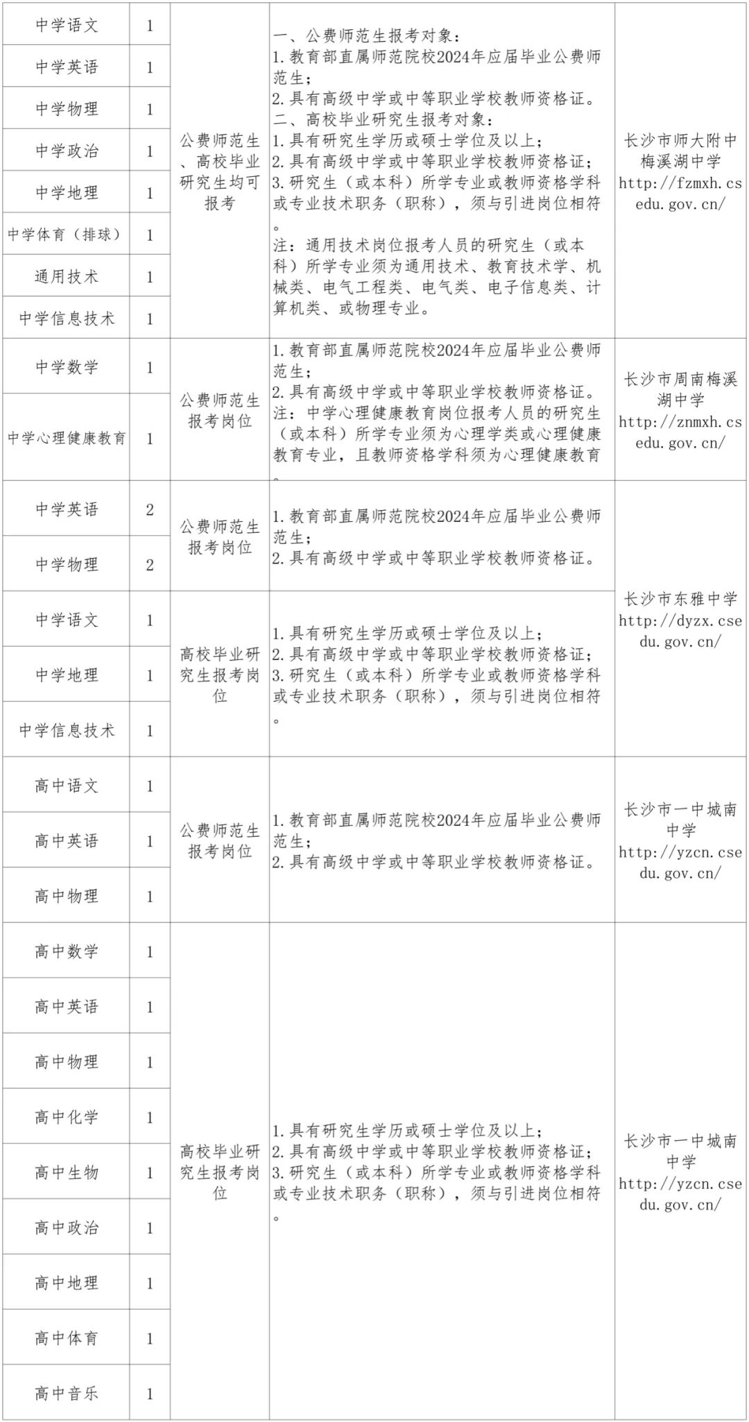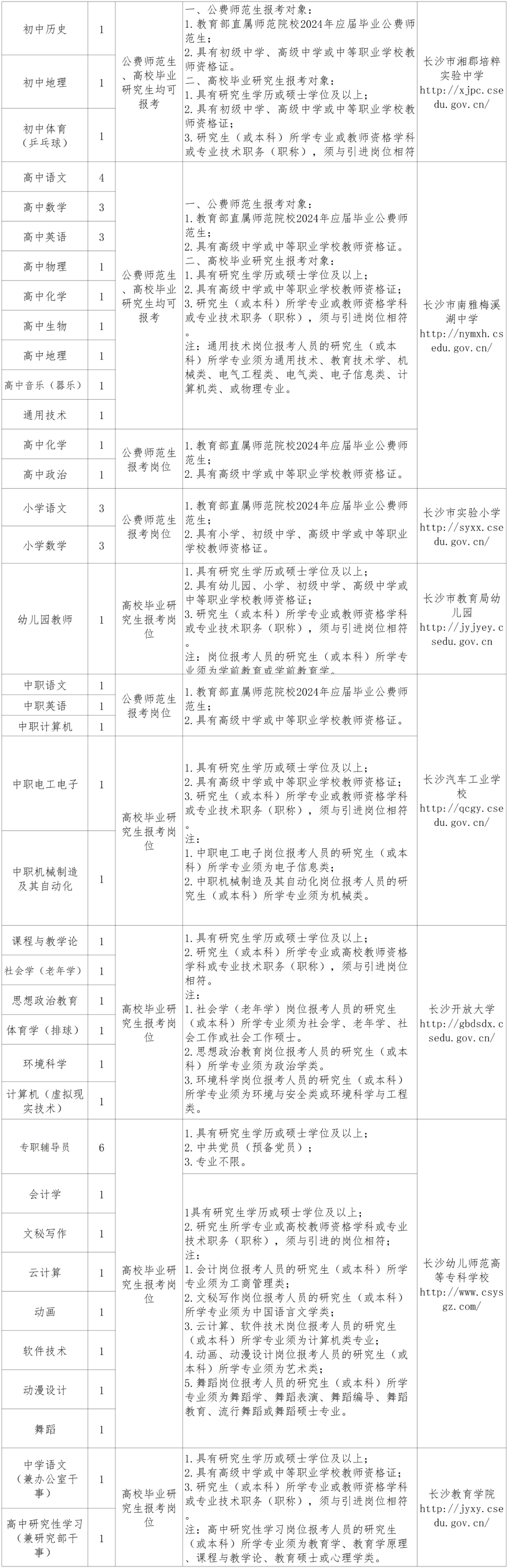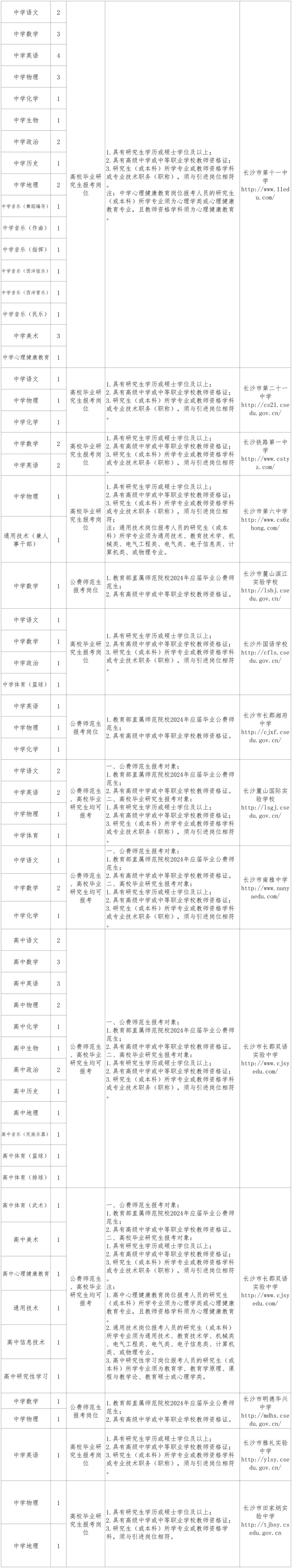 根据《事业单位人事管理条例》(国务院令652号)、《事业单位公开招聘违纪违规行为处理规定》(人社部令第35号)、《湖南省事业单位公开招聘人员办法》(湘人社发〔2019〕1号)、《中共长沙市委 长沙市人民政府关于全面深化教师队伍建设的实施意见》(长发〔2019〕10号)和《人力资源社会保障部办公厅 教育部办公厅关于做好2023年中小学幼儿园教师公开招聘工作的通知》(人社厅函〔2023〕34号)的精神,按照事业单位人事制度改革的要求,长沙市教育局决定对所属37个事业单位2024年需增补的480名教职工面向社会进行公开招聘(公费师范生、高校毕业研究生、骨干教师、职员)。编制使用计划经中共长沙市委机构编制委员会办公室批准。现将有关事项公布如下: