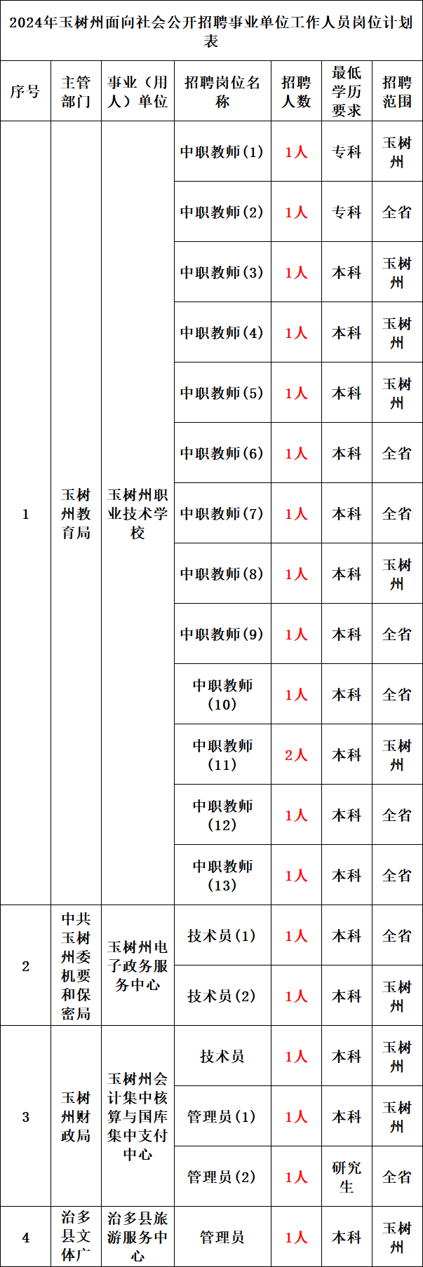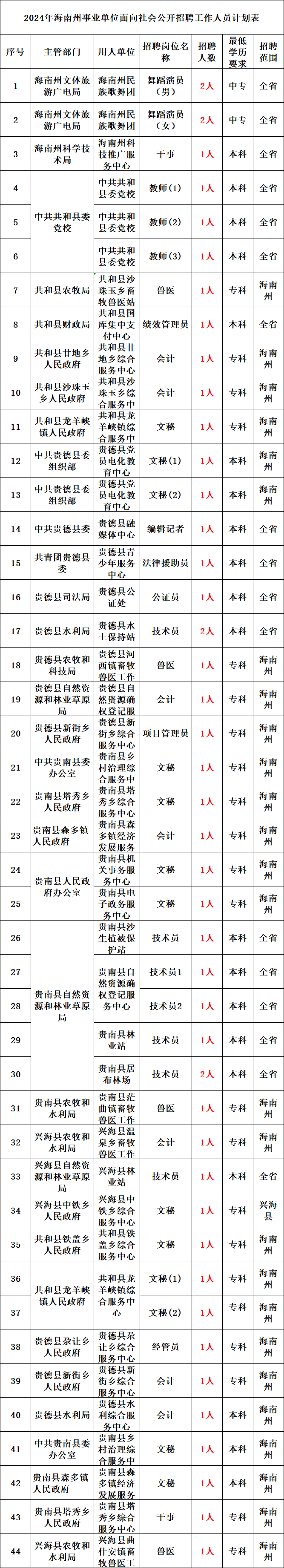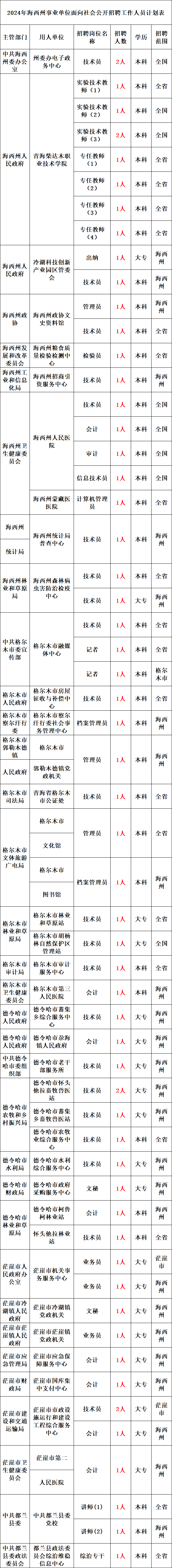 根据《2024年全省事业单位人员招聘工作方案》(青政办函〔2024〕21号)和《青海省事业单位公开招聘工作人员办法》(青人社厅发〔2015〕80号)等规定,现将2024年省直事业单位面向社会公开招聘工作人员有关事项公告如下。