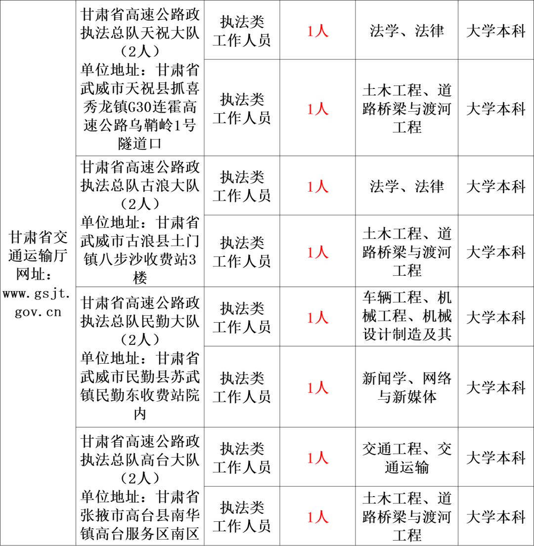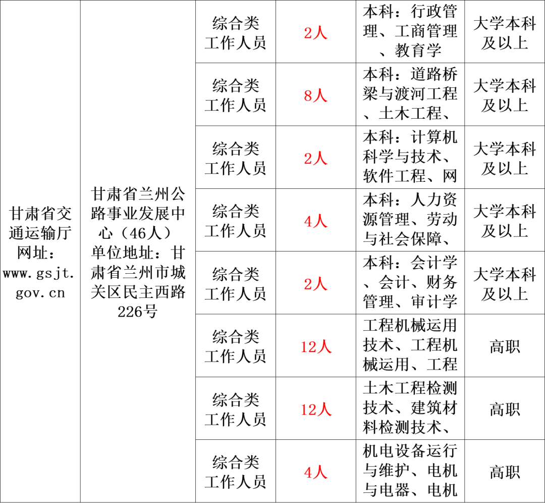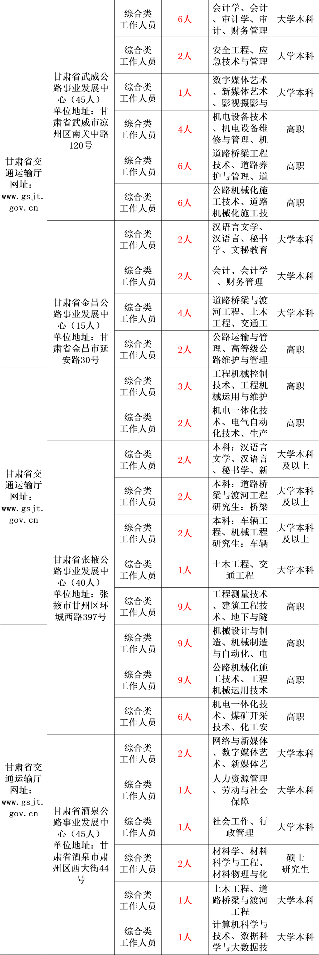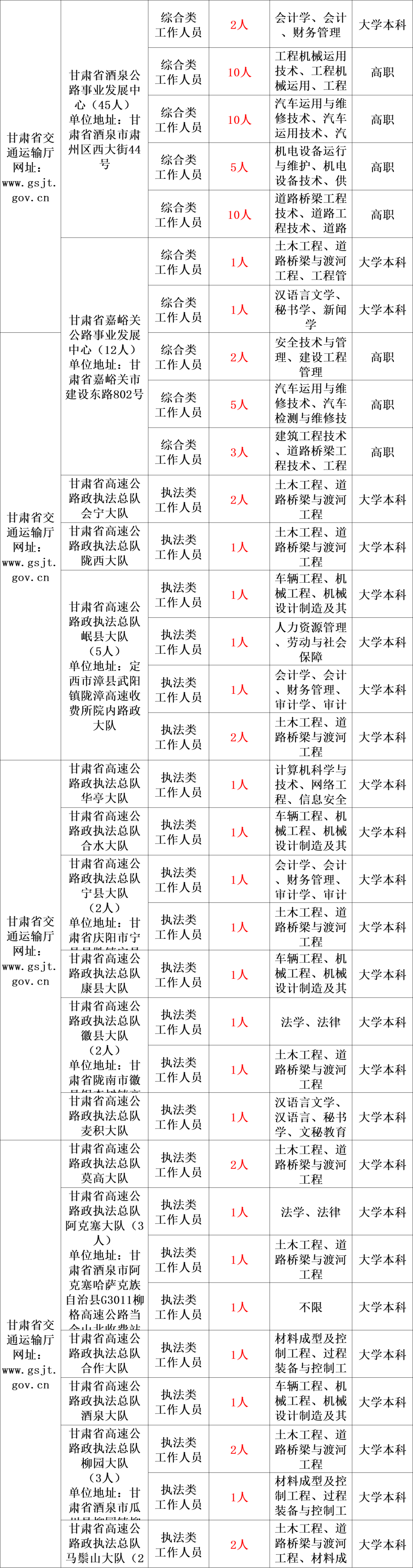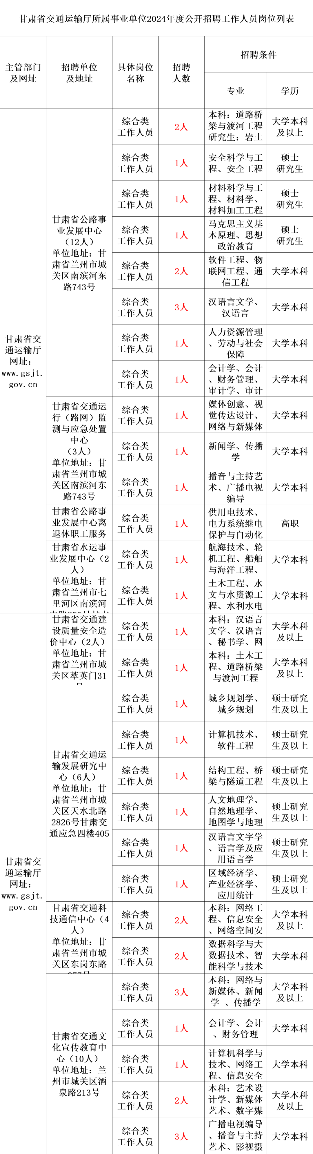 《甘肃省交通运输厅所属事业单位2024年度公开招聘工作人员岗位列表》(以下简称《岗位列表》)按照国务院学位委员会、教育部《关于印发<学位授予和人才培养学科目录(2011年)>的通知》(学位〔2011〕11号)(研究生层次“学位授予和人才培养学科目录”按照教育部2018年4月更新目录执行)、《教育部关于印发<普通高等学校本科专业目录(2012年)><普通高等学校本科专业设置管理规定>等文件的通知》(教高〔2012〕9号)、《教育部关于公布2019年度普通高等学校本科专业备案和审批结果的通知》(教高函〔2020〕2号)、《教育部关于公布2022年度普通高等学校本科专业备案和审批结果的通知》(教高函〔2023〕3号)、《教育部关于印发<普通高等学校高等职业教育(专科)专业设置管理办法>和<普通高等学校高等职业教育(专科)专业目录(2015年)>的通知》(教职成〔2015〕10号)规定的规范称谓表述。国内外相近专业、高校自设专业、专业硕士由省交通运输厅招聘工作领导小组研究审定后,纳入招聘范围。如果应聘人员所学专业属毕业院校自设专业,须由应聘人员毕业院校开具说明,认定所学的专业属于岗位要求的专业类,并附本人所学课程成绩单,在资格复审时一并提供审核。具体招聘岗位及招聘条件见《岗位列表》。