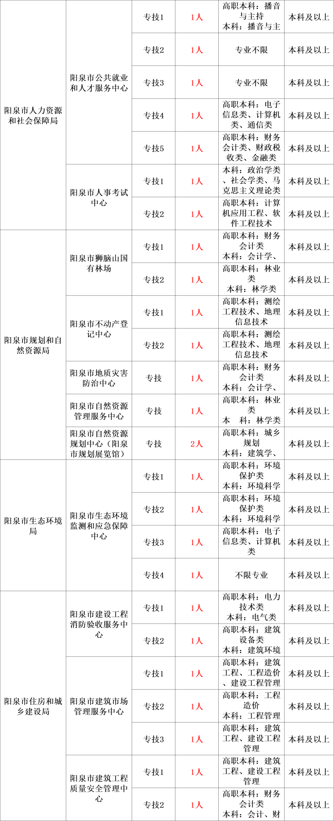 为进一步加强人才队伍建设,改善事业单位工作人员队伍结构,根据《事业单位人事管理条例》、《关于进一步改进和加强事业单位公开招聘工作的意见》(晋人社厅发〔2017〕35号)《关于做好2024年全省事业单位公开招聘工作的通知》(晋人社厅发〔2023〕88号)和《关于做好2024年全市事业单位公开招聘工作的通知》(阳人社发〔2024〕3号)等政策规定和要求,结合市委组织部、市人社局下达的招聘计划,经研究面向社会公开招聘工作人员857名,现公告如下: