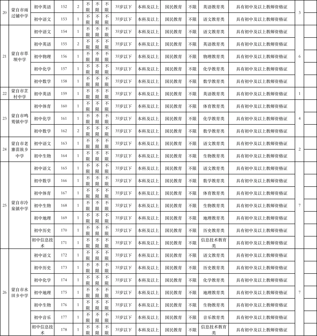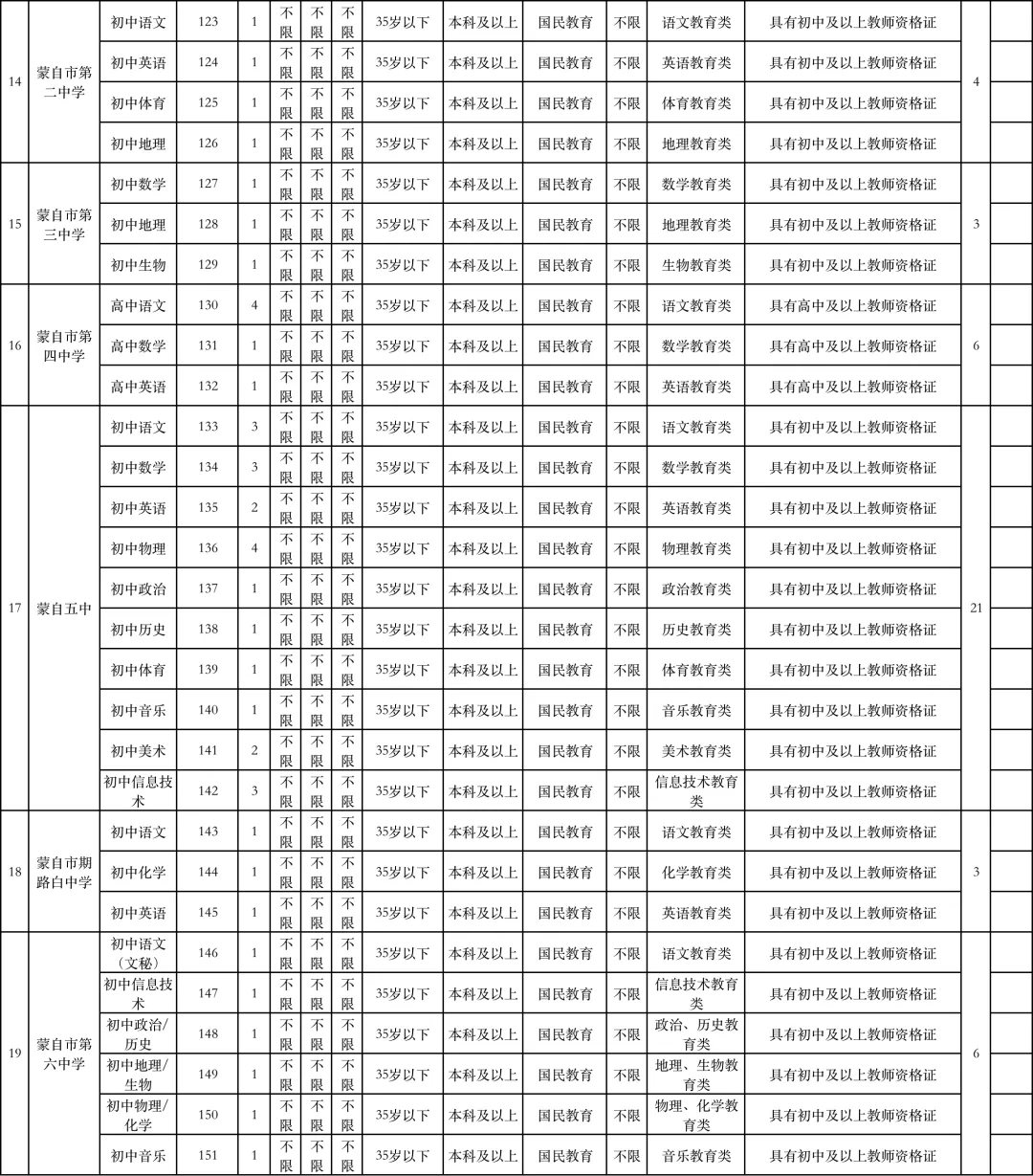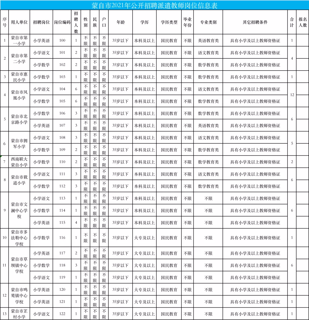 根据蒙自市教育体育局所属学校用工需求,参照《事业单位人事管理条例》、《事业单位公开招聘人员暂行规定》、《云南省事业单位公开招聘工作人员办法》、《红河州事业单位公开招聘工作人员实施意见》等相关规定,遵循“公开、平等、竞争、择优”的考录原则,拟面向社会公开招聘126名劳务派遣制教师到蒙自市教育体育局所属中小学任教,现就招聘有关事宜公告如下:(一)具有中华人民共和国国籍,热爱祖国,拥护中国共产党的领导和党的路线、方针、政策,热爱教育事业。(二)遵纪守法,品行端正,具有良好的职业道德和为人民服务的精神。1.省内外普通高等院校毕业生,小学教师岗位及中学教师岗位(详见岗位信息表);35周岁以下,具备工作经验者可优先录用;3.具有相应的教师资格证(暂未取得教师资格证的,聘用后一年内需取得相应教师资格证,否则解除聘用)。3.受到刑事处罚期限未满或者正在接受司法调查尚未做出结论的人员;4.五年内因违纪被所在单位取消录用(招聘)资格、开除、辞退、解除聘用合同的人员;5.五年内在机关事业单位招录(招聘)考试、体检或考察中存在违纪违规行为的人员;招聘工作按照发布招聘公告、组织报名、笔试、面试、体检、确定拟聘对象、办理聘用手续等步骤进行。(一)报名方式:现场报名。报名考生须提供以下材料:1.填写《蒙自市2021年公开招聘劳务派遣制报名表》(提供近期5分彩色相片1张)。2.带身份证、学历证、教师资格证(或普通话等级证)原件和复印件。考生提供报名材料应当真实、准确,提供虚假信息的,将按有关规定进行查处,无证明材料不得报名。3.由于疫情特殊情况,为保证用人单位工作人员及报名人员的安全健康,报名时需提供以下材料:①前来报名应聘者需提供绿色健康码复印件,以及行程码中没有中高风险地区轨迹;②根据防疫要求,请应聘者填写《健康承诺书》(附件1),并携带纸质版前来报名。(二)报名时间:2021年8月16日至8月19日。上午8∶30~11∶30,下午14∶00~17∶30。(三)报名地点:蒙自市米线小镇E4幢205室蒙自惠源人力资源有限责任公司。(四)考试安排:考试分为笔试和面试,笔试占40%,面试占60%,笔试成绩按每个岗位1∶3进入面试,招聘岗位达不到比例的,按实有报考人数进入面试。(五)笔试内容:教育教学基本理论及本学科专业知识。分值100分,其中,教育教学基本理论占总分的20%,学科专业知识占总分的80%。准考证领取时间:2021年8月22日8:30至12点1.根据《蒙自惠源人力资源有限责任公司招聘劳务派遣制教师招聘公告》的相关要求,资格审核通过后通知进行面试。面试由所报考的学校组织,面试主要考核考生教育教学能力。小学、初中教师面试采取课前说课方式进行,说课内容范围:现行九年义务教育教材内容,其中:初中为八年级下学期,小学为五年级下学期。由考生根据报考学科自行准备说课内容,进行10~15分钟说课,由面试考官组根据考生说课情况进行现场评分。面试成绩满分为100分。面试成绩低于60分者不得参加体检。2.面试时间:8月25日,面试人员名单在QQ群公布。2.面试考生应自觉遵守纪律,自觉服从工作人员的管理,不得携带手机、书籍等进入面试考室。考生在等待面试期间,要在工作人员的安排下,到指定地点候考,不准高声喧哗,爱护公共财物,讲究公共卫生。3.考生逾时15分钟不到面试考场报到者,视为自动放弃面试。4.面试结束后,根据岗位数和按总成绩从高到低确定拟聘人员并组织体检(体检费用自理)。请考生自带一张小1寸照片作为体检备用。按笔试40%,面试60%为总成绩从高到低按岗位数确定拟聘人员后进入体检,体检由惠源公司统一组织,费用考生自理。因体检不合格或自动放弃等原因造成缺额的,依据考试成绩由高到低进行递补。(一)考生要如实提供所需材料,发现有不符合派遣教师招聘条件的人员,将取消聘用资格。(二)拟聘用人员与蒙自惠源人力资源有限责任公司签订三年一签的劳动合同,并派遣到蒙自市教育局下属单位工作,试用期6个月,试用期2500元/月(含个人应缴五险部分)+岗位津贴,试用期结束聘用后月工资3000元(含个人应缴五险部分)+岗位津贴。公司按照国家相关规定为员工缴纳养老保险、医疗保险、工伤保险、生育保险、失业保险。1.蒙自市2021年公开招聘派遣教师岗位信息表.xls2.蒙自市2021年公开招聘派遣教师岗位报名表.xlsx新冠肺炎疫情防控期间校园招聘会健康承诺书.docx