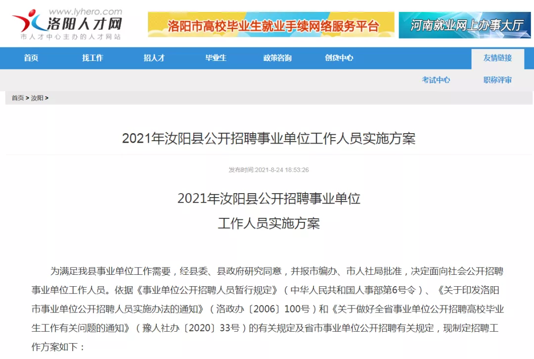 为满足我县事业单位工作需要,经县委、县政府研究同意,并报市编办、市人社局批准,决定面向社会公开招聘事业单位工作人员。依据《事业单位公开招聘人员暂行规定》(中华人民共和国人事部第6号令)、《关于印发洛阳市事业单位公开招聘人员实施办法的通知》(洛政办〔2006〕100号)和《关于做好全省事业单位公开招聘高校毕业生工作有关问题的通知》(豫人社办〔2020〕33号)的有关规定及省市事业单位公开招聘有关规定,现制定招聘工作方案如下: