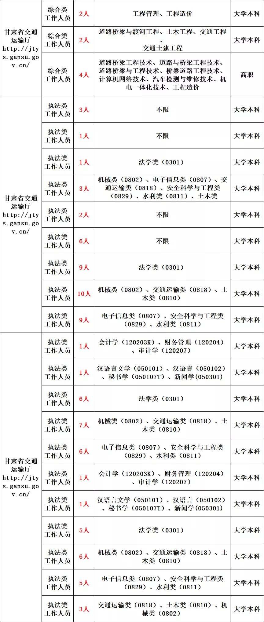 (二)拥护中华人民共和国宪法,拥护中国共产党领导和社会主义制度。(六)具备岗位所需的学历、专业及技能条件。其中,应聘人员毕业证上标注的学历及专业应当与招聘岗位要求的学历及专业一致。(七)年龄为18周岁以上,35周岁以下(1985年9月6日至2003年9月6日期间出生),硕士研究生、博士研究生不超过40周岁(1981年9月6日以后出生),2021年普通高校毕业生不受年龄限制。《岗位列表点击获取职位表》中按照国务院学位委员会、教育部《关于印发<学位授予和人才培养学科目录(2011年)>的通知》(学位〔2011〕11号)(研究生层次“学位授予和人才培养学科目录”按照教育部2018年4月更新目录执行)、《教育部关于印发<普通高等学校本科专业目录(2012年)><普通高等学校本科专业设置管理规定>等文件的通知》(教高〔2012〕9号)、《教育部关于公布2019年度普通高等学校本科专业备案和审批结果的通知》(教高函〔2020〕2号)、《教育部关于印发<普通高等学校高等职业教育(专科)专业设置管理办法>和<普通高等学校高等职业教育(专科)专业目录(2015年)>的通知》(教职成〔2015〕10号)规定的规范称谓表述。如果应聘人员所学专业属毕业院校自设专业,未在上述专业目录中包含,经招聘单位同意,须由应聘人员毕业院校开具说明,认定所学的专业属于岗位要求的专业类,并附本人所学课程成绩单,在资格复审时一并提供审核。省高速公路路政执法总队执法类岗位(17024-17043岗位)的应聘人员,其所学专业必须包含在《教育部关于公布2019年度普通高等学校本科专业备案和审批结果的通知》(教高函〔2020〕2号)附件2《普通高等学校本科专业目录》规定的专业类中。因犯罪受过刑事处罚的人员、被开除中国共产党党籍的人员、被开除公职的人员、被依法列为失信联合惩戒对象的人员,在国家法定考试、各级公务员及事业单位招考中被认定有舞弊等严重违反录用纪律行为的人员,以及法律法规规定不得报考的其他情形的人员,不得报考。应聘人员不得报考聘用后即构成回避关系的招聘岗位,即与本人有夫妻关系、直系血亲关系、三代以内旁系血亲关系、近姻亲关系的人员担任领导成员的用人单位的岗位,以及有其他影响情形的岗位。