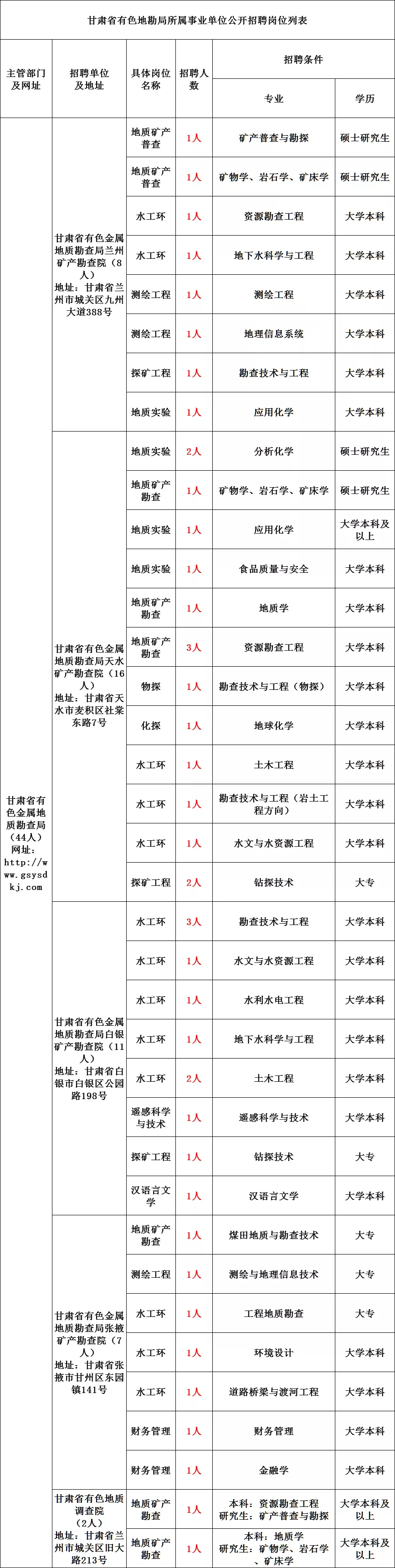 根据《事业单位公开招聘人员暂行规定》(人事部令第6号) 《甘肃省事业单位公开招聘人员暂行办法》(甘办发〔2011〕22号)和省委组织部省人社厅《关于进一步优化事业单位岗位管理和公开招聘工作的通知》(甘人社通〔2020〕208号)规定,2021年下半年甘肃省有色金属地质勘查局(以下简称甘肃省有色地勘局)所属5个事业单位面向社会公开招聘44人点击获取职位表。现将有关事项公告如下:(一)具有中华人民共和国国籍,享有公民的基本政治权利。(三)身心健康,无重大疾病,能适应野外地质工作的要求,无色盲色弱;吃苦耐劳,勤奋敬业。(四)具备岗位所需的学历、学位、专业、资格及工作经历等条件。特别提示:如果报考人员所学专业不属于国务院学位委员会、教育部《关于印发<学位授予和人才培养学科目录(2011年)>的通知》(学位〔2011〕11号)(研究生层次“学位授予和人才培养学科目录”按照教育部2018年4月更新目录执行)、《教育部关于印发<普通高等学校本科专业目录(2012年)><普通高等学校本科专业设置管理规定>等文件的 通知》(教高〔2012〕9号)、《教育部关于公布2019年度普通高等学校本科专业备案和审批结果的通知》(教高函〔2020〕2号)、《教育部关于印发<普通高等学校高等职业教育(专科)专业设置管理办法>和<普通高等学校高等职业教育(专科)专业目录(2015年)>的通知》(教职成〔2015〕10号)规定的规范称谓表述,未在上述专业目录中包含,经招聘单位同意,须由报考人员毕业院校开具说明,认定所学的专业属于岗位要求的专业类,并附本人所学课程成绩单,在资格复审时一并提供审核。天水矿产勘查院岗位代码为05015和05018两个岗位的报考人员,如所学专业与岗位要求专业名称相近但不完全相同,经招聘单位同意,须由报考人员毕业院校开具说明,认定所学的专业属于岗位要求的专业类,并附本人所学课程成绩单,在资格复审时一并提供审核。(五)年龄为18周岁以上,35周岁以下(1985年9月13日至2003年9月13日期间出生),硕士研究生或具有中级职称资格的人员、博士研究生或具有高级职称资格人员不超过40周岁(1980年9月13日以后出生)。其中,报考汉语言文学、财务管理岗位的为18周岁以上,30周岁以下(1990年9月13日至2003年9月13日期间出生)。1.曾在各级公职人员招考中被认定有舞弊等严重违反考试录用纪律行为的。