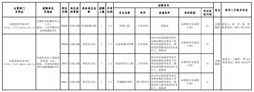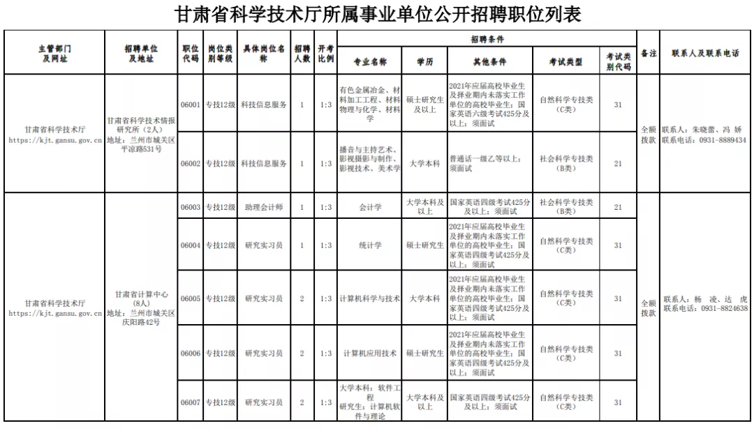 根据《甘肃省事业单位公开招聘人员暂行办法》(甘办发〔2011〕22号)和《关于进一步优化事业单位岗位管理和公开招聘工作的通知》(甘人社通〔2020〕208号),甘肃省科学技术厅研究决定,为厅属4家事业单位公开招聘工作人员14人点击获取职位表,招聘对象主要面向2021年应届高校毕业生和择业期内未落实工作单位的高校毕业生,个别岗位面向社会公开招聘(具体岗位见《甘肃省科学技术厅所属事业单位公开招聘职位列表点击获取》)。现将有关事项公告如下: