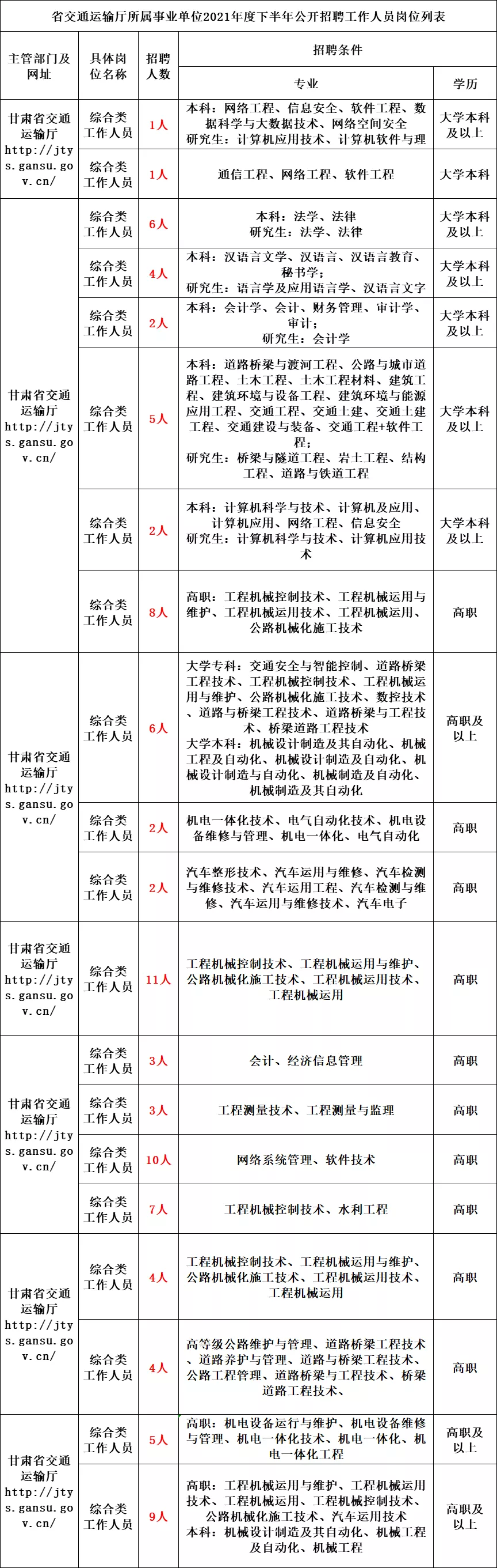 根据《事业单位公开招聘人员暂行规定》(人事部令第6号)、《甘肃省事业单位公开招聘人员暂行办法》(甘办发〔2011〕22号)、《关于进一步优化事业单位岗位管理和公开招聘工作的通知》(甘人通〔2020〕208号)精神,经省人力资源和社会保障厅同意,省交通运输厅所属9个事业单位2021年度下半年面向社会公开招聘事业编制工作人员189名点击获取职位表,其中,管理岗位112名,专业技术岗位15名,工勤技能岗位62名,具体招聘岗位见《甘肃省交通运输厅所属事业单位2021年度下半年公开招聘工作人员岗位列表》(以下简称《岗位列表》)。现将有关事项公告如下