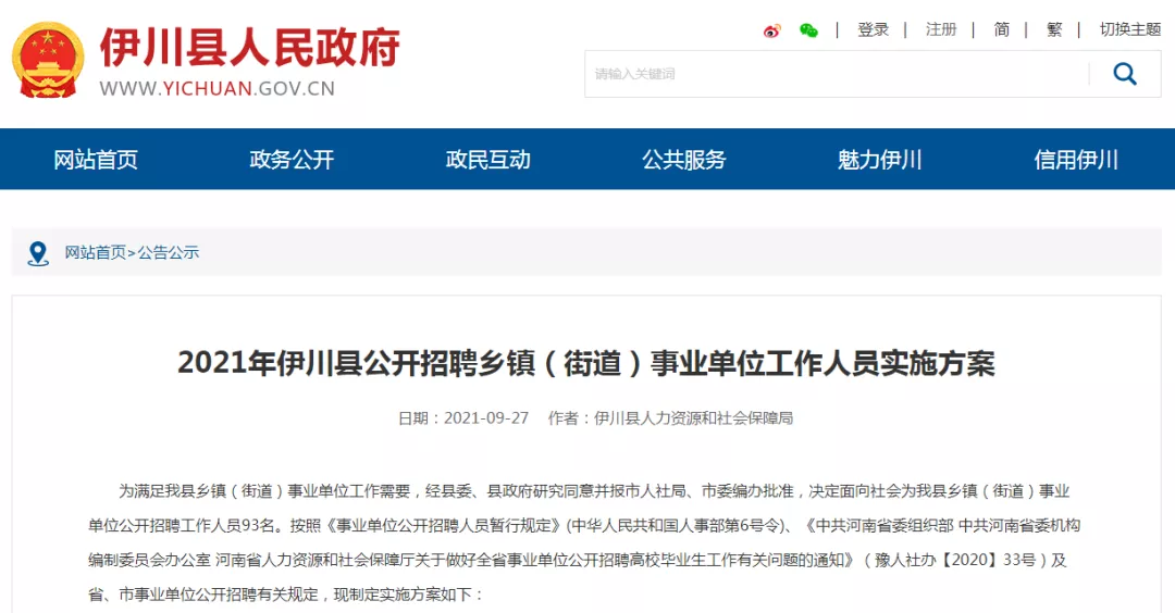 本次招聘工作在县委、县政府的领导下,成立2021年伊川县事业单位公开招聘工作领导小组,具体工作由县人力资源和社会保障局组织实施,县纪委监委全程监督。