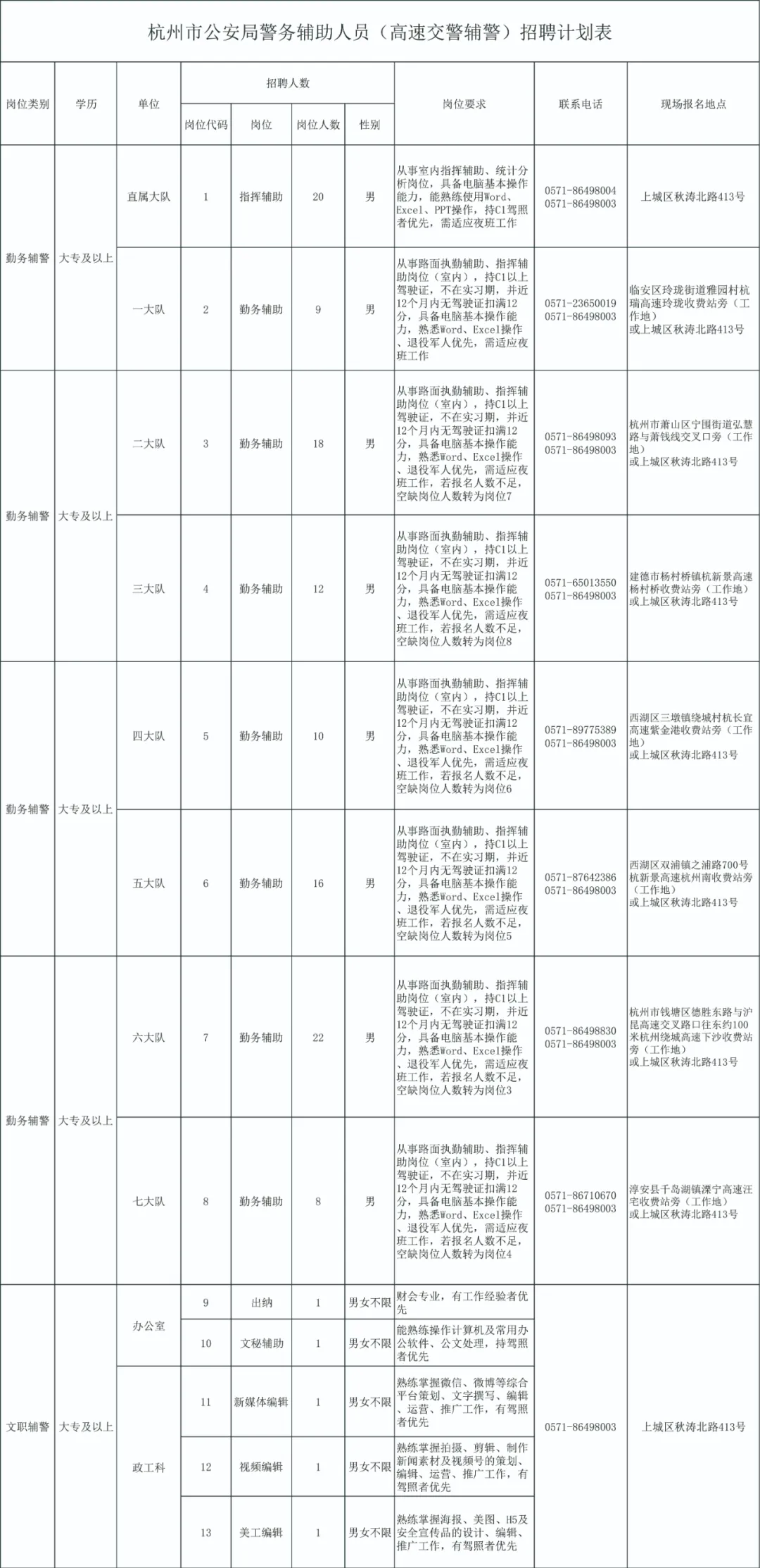 因公安工作需要,根据《杭州市公安机关警务辅助人员管理规定》和市政府文件要求,杭州市公安局面向社会公开招聘一批警务辅助人员(高速交通管理辅警)120名,招聘事项公告如下:本次共计划招聘警务辅助人员(高速交通管理辅警)120名,从事杭州市公安局高速公路交通警察支队交通辅助和路面巡逻工作。(一)直属大队20人(工作地:杭州市上城区秋涛北路413号);(二)一大队9人(工作地:临安区玲珑街道雅园村杭瑞高速玲珑收费站旁);(三)二大队18人(工作地:杭州市萧山区宁围街道弘慧路与萧钱线交叉口旁);(四)三大队12人(工作地:建德市杨村桥镇杭新景高速杨村桥收费站旁);(五)四大队10人(工作地:西湖区三墩镇绕城村杭长宜高速紫金港收费站旁);(六)五大队16人(工作地:西湖区双浦镇之浦路700号杭新景高速杭州南收费站旁);(七)六大队22人(工作地:杭州市钱塘区德胜东路与沪昆高速交叉路口往东约100米杭州绕城高速下沙收费站旁);(八)七大队8人(工作地:淳安县千岛湖镇溧宁高速汪宅收费站旁);(九)机关5人(工作地:杭州市上城区秋涛北路413号)。(一)具有中华人民共和国国籍,年满18周岁以上,35周岁以下(1986年10月1日之后出生);(二)拥护中华人民共和国宪法,遵守国家法律法规,品行端正;(四)具有大专以上文化程度和履行岗位职责所需的工作能力,有一定的文字功底、能熟练操作计算机,岗位需适应夜班。部分岗位需本科学历;(五)同等条件下,优先招聘公安类或政法类院校毕业生,具有岗位所需专业资质或专门技能的人员,退役士兵,见义勇为积极分子和先进个人,以及在职公安民警的配偶、子女;(六)烈士、公安英模,因公牺牲和一至四级伤残民警,以及因工(公)死亡、一至四级伤残警务辅助人员的配偶、子女(无配偶子女的可为同胞兄弟姐妹),招聘条件可适当放宽。(一)本人或家庭成员、主要社会关系人参加非法组织、邪教组织或者从事其他危害国家安全活动的;(二)本人家庭成员或主要社会关系人正在服刑或正在接受调查的;(四)编造、散布有损国家声誉、反对党的理论和路线方针政策、违反国家法律法规信息的;(八)被开除公职、开除军籍或者因违纪违规被辞退解聘的;按照公开、平等、竞争、择优的原则,考生自愿报名,通过资格审查、体能测试、笔试、面试、体检、考察、公示、录用等程序进行。