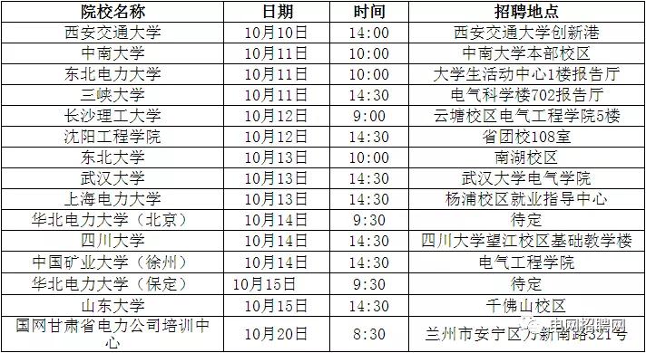 本批校园招聘将于10月10日开始,具体行程如下,如有变更,在国网招聘平台动态更新。符合招聘条件的毕业生可就近选择参加,做好个人防疫措施。