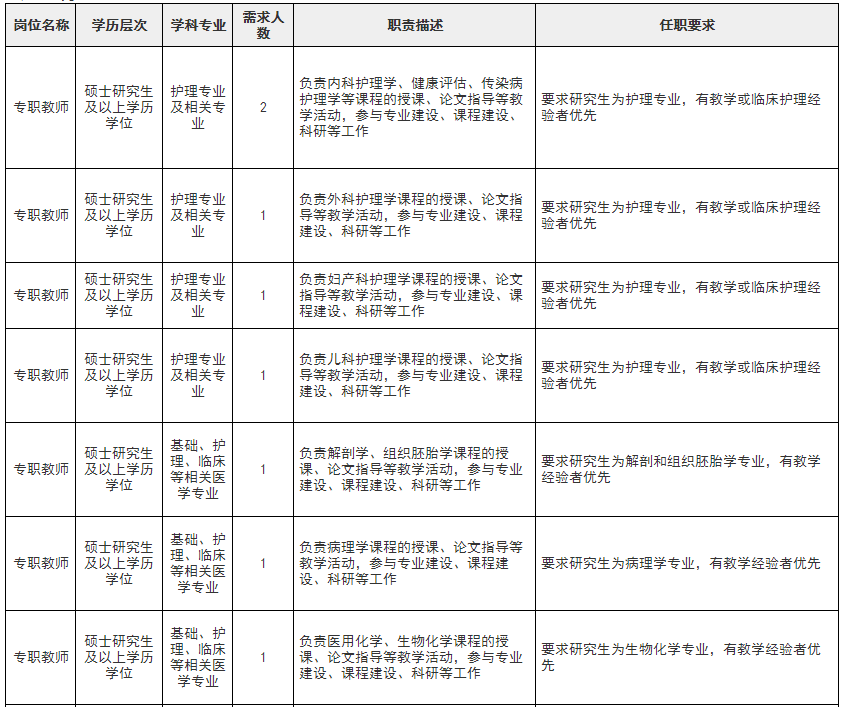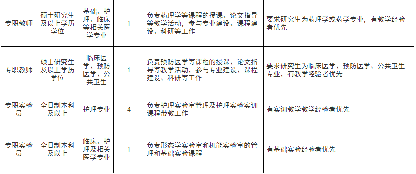 备注:教授可放宽学历要求;医学类人员若专业对口,具备中级教师系列或卫生系列专业技术职务,学历条件可适当放宽,具体咨询我院人事处。