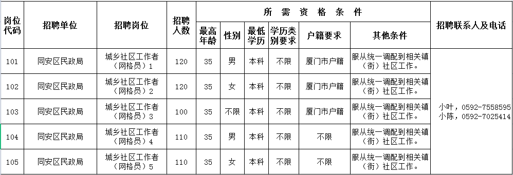 1.《厦门市同安区招聘城乡社区工作者(网格员)岗位信息表》