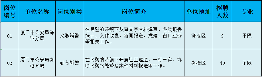 具体招聘岗位详见《厦门市公安局海沧分局招聘警务辅助人员岗位表》。