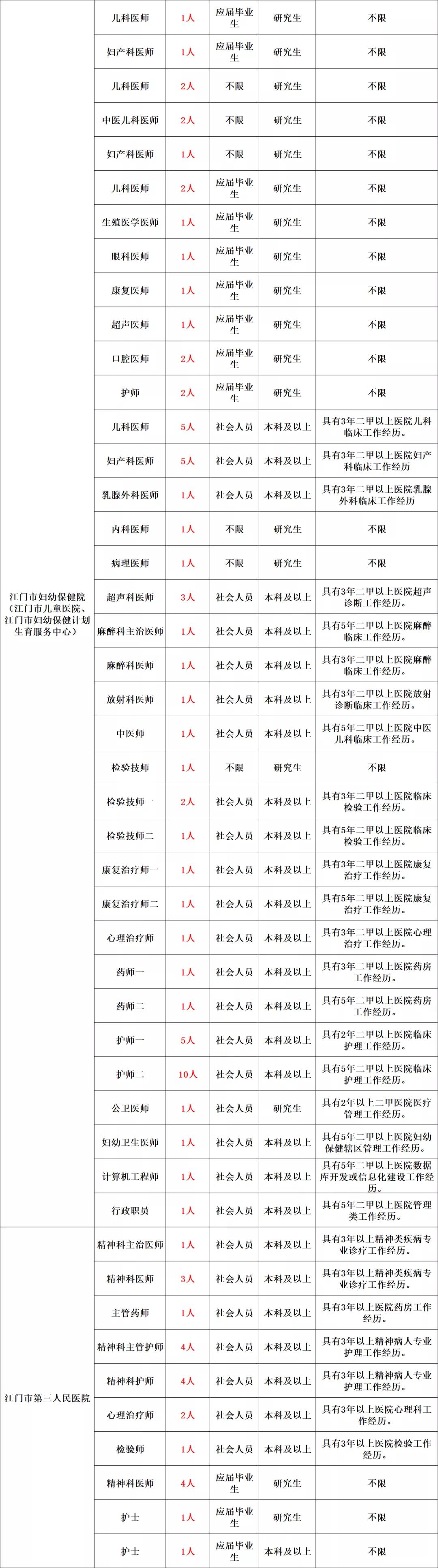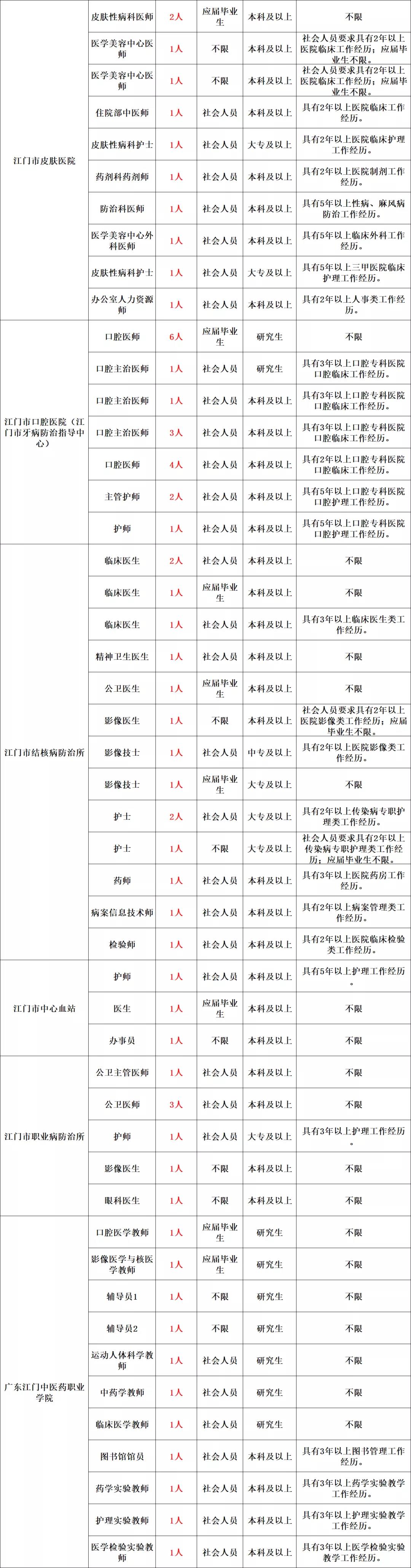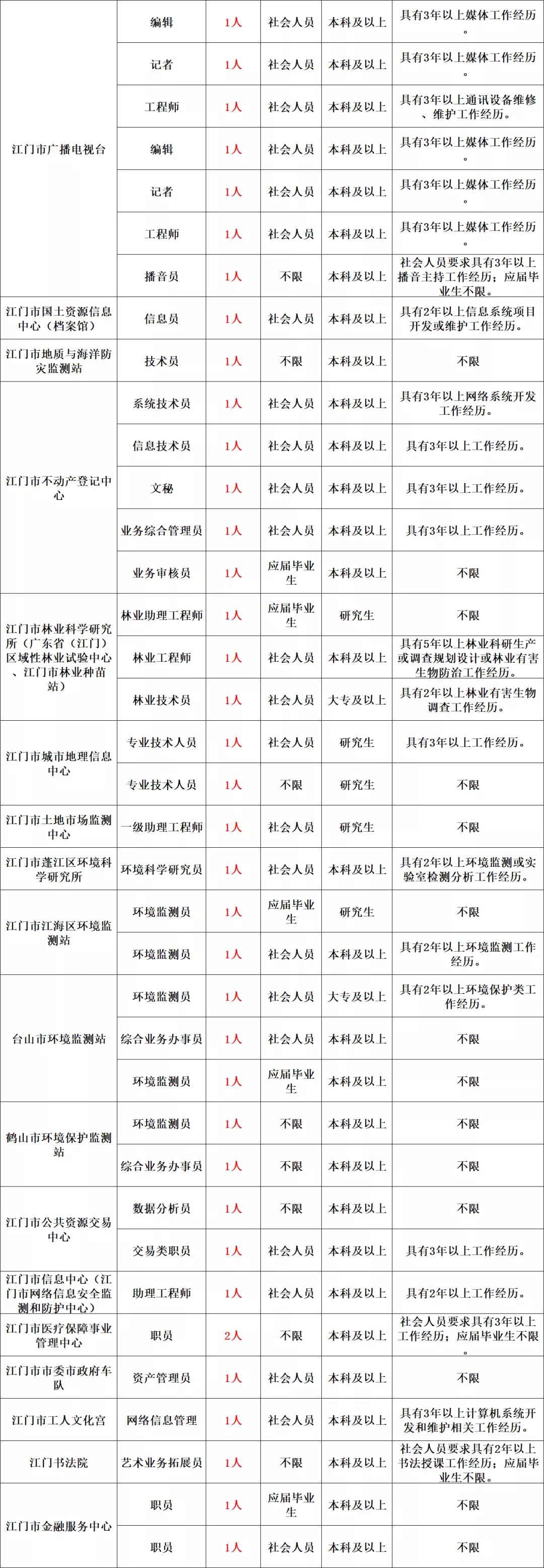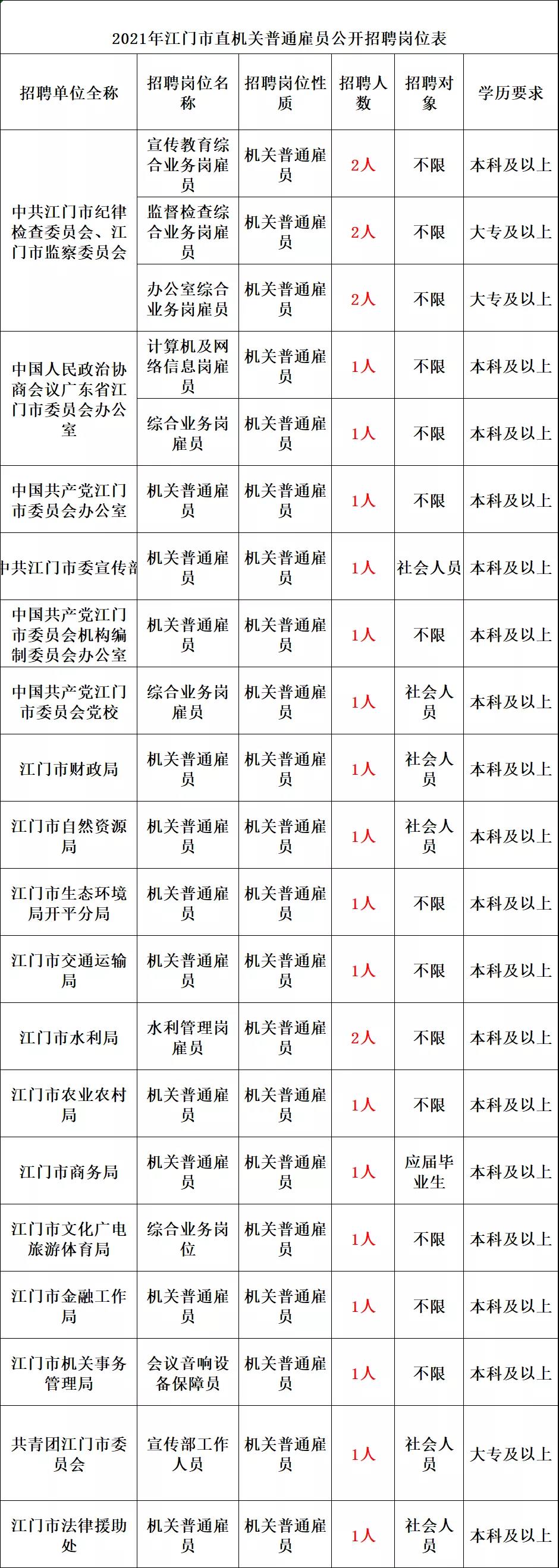 详见《2021年江门市直事业单位工作人员公开招聘岗位表》(附件1)、《2021年江门市直机关普通雇员公开招聘岗位表》(附件2)。招聘对象分“应届毕业生”、“社会人员”、“不限”三类。(一)应届毕业生。指国家统一招生的普通高校、技师学院2021年应届毕业生,且就读期间个人档案、组织关系保管在就读院校。在本公告发布当月,处于未就业状态的2019、2020年毕业的大专、本科、硕士研究生,及2016年以来毕业的博士研究生,可参照应届毕业生条件报考。(二)社会人员。指除应届毕业生外,已取得国家承认学历的人员。港澳台学习、留学归国人员报考时须取得相应学历学位方可报考。截至公告发布之日毕业未满1年的,视为应届毕业生(毕业时间以毕业证落款时间为准);已满1年的,视为社会人员。1.年龄要求。只针对社会人员,应届毕业生不受年龄限制。2.专业、学历、学位要求。考生应符合招聘岗位所要求的专业、学历、学位条件。招聘岗位没有学位要求的,考生是否取得学位不影响报考。具有高级工、技师(高级技师)职业资格证的,可分别视同具有大专、本科学历,但仅限报考没有专业要求的岗位。应届毕业生应于2021年12月31日前获得相应学历学位点击获取职位表。招聘单位根据用人需要,按照《广东省2021年考试录用公务员专业参考目录》(附件3)、教育部《中等职业学校专业目录(2010年修订)》(附件4)设置了招聘岗位专业条件,考生毕业证书所列专业应与招聘岗位要求的专业一致。考生所学专业未列入专业目录的,可选择专业目录内相近专业报考,所学专业必修课程须与该相近专业主要课程基本一致;考生所学专业已列入专业目录内的,不得按相近专业报考。考生学位种类、学校院系种类、毕业证专业名称后以括号等形式列出的培养方向,均不能作为判断考生所学专业的依据。招聘岗位以括号形式提出了具体专业方向的,考生还须符合专业方向要求。港澳台学习、留学归国人员所学专业,以教育部中国留学服务中心认定的专业名称为准。3.专业技术资格、职业资格、执业资格及其他资格要求。以考生具有相关证书或获得资格核定部门的正式批文为准。仅考试、考核合格,但还未获得证书或批文的,不视为已具备相应资格。相关证书还须符合招聘岗位所设证书类别、专业、级别要求。考生不能以职业资格证报考要求专业技术资格证的岗位。4.工作经历要求。以在工作单位参加社会保险或经人力资源社会保障部门用工备案的起始时间算起。部队服役经历视为工作经历,但不视为指定类型的工作经历。考生在校全日制学习期间参加社会实践或者参加相关工作,即使与单位签订劳动合同并缴纳了社会保险,也不视为工作经历。计算工作经历截止时间为本公告发布之日前1天。