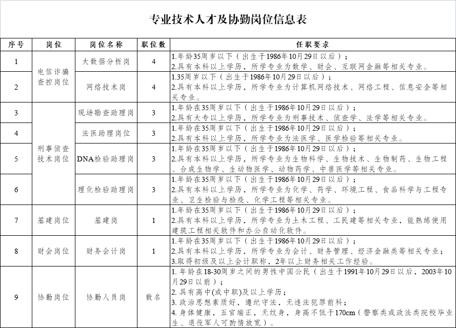 大数据分析岗4人、网络技术岗4人、现场勘查助理岗3人、法医助理岗3人、DNA检验助理岗3人、理化检验助理岗3人、基建岗1人、财务会计岗1人、协勤人员数名,共计100名。