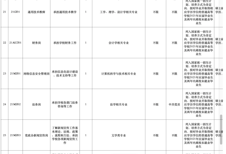 报考人员可在附件查询岗位所要求的专业、学历、学位、资格条件等信息,若有疑问,请报考人员在工作时间内与学校人事部门联系(联系人:韩老师,联系方式:18911781008)。