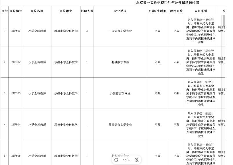 根据《北京市事业单位公开招聘工作人员实施办法》(京人社专技发〔2010〕102号)、《关于进一步规范事业单位公开招聘工作有关问题的通知》(京人社专技发〔2012〕247号)、《国务院办公厅关于应对新冠肺炎疫情影响强化稳就业举措的实施意见》(国办发〔2020〕6号)、《北京市引进毕业生管理办法》(京人社毕发〔2021〕22号)等文件精神,北京第一实验学校现根据办学需要,拟面向社会进行公开招聘。具体招聘要求及程序说明如下: