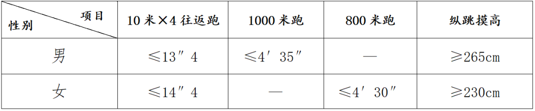 3.体能测评。根据考试总成绩,由高分到低分按1:1.5的比例确定入围体能测评人选(测评项目及标准见下表)。体能测评为达标性测试,成绩不计入考试总成绩,凡其中一项不达标的,视为体能测评不合格,不能确定为体检考察人选。