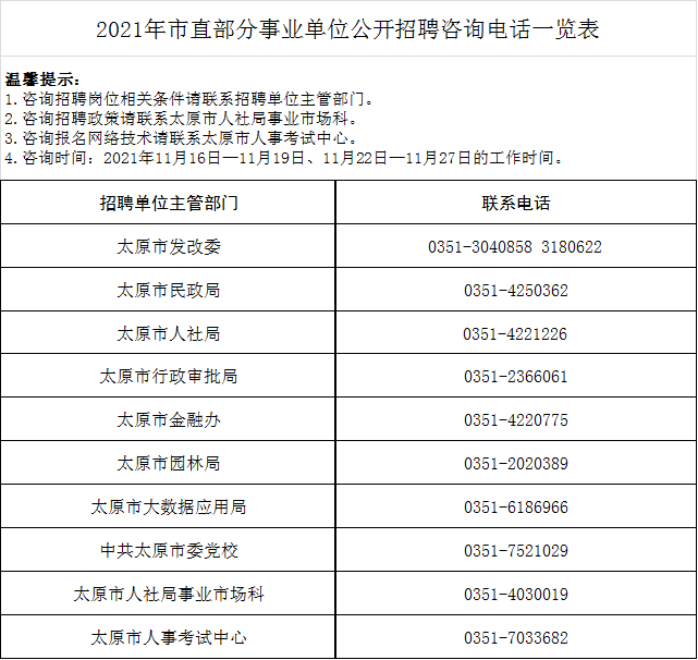 报名期间,咨询报名资格条件等请联系各主管部门,联系电话见《岗位表》;咨询报名网络技术请联系太原市人事考试中心,联系电话:0351-7033682。