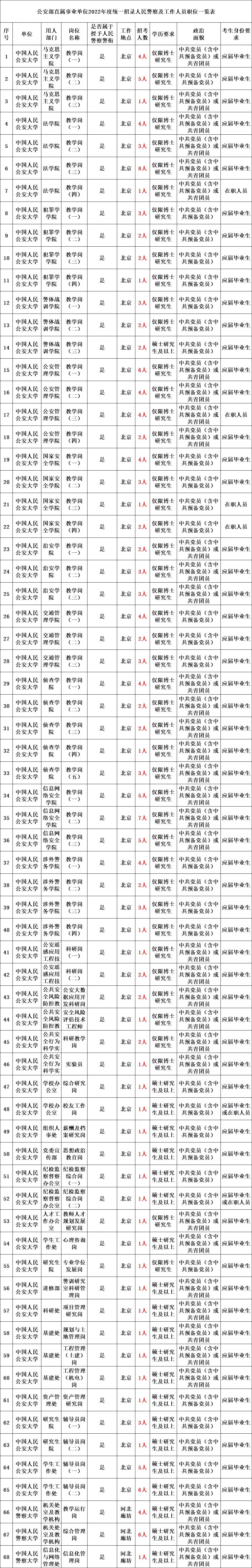 为认真贯彻落实党中央全面从严治党、从严管理干部要求和公安部党委政治建警、全面从严治警有关决策部署,根据人力资源社会保障部、公安部、国家公务员局《关于加强公安机关人民警察招录工作的意见》和中央编办、人力资源社会保障部、公安部、教育部、财政部、国家公务员局《关于公安院校公安专业人才招录培养制度改革的意见》以及国家关于事业单位人事管理等相关规定,结合工作需要,公安部将组织实施部直属事业单位2022年度统一招录人民警察及工作人员工作。现将有关事项公告如下: