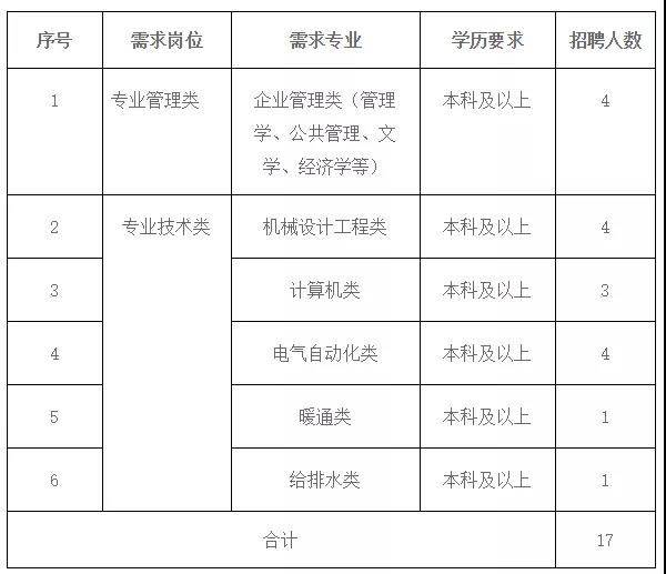 本次共招聘17人,其中专业管理类岗位4人,专业技术类岗位13人,具体明细见下表。