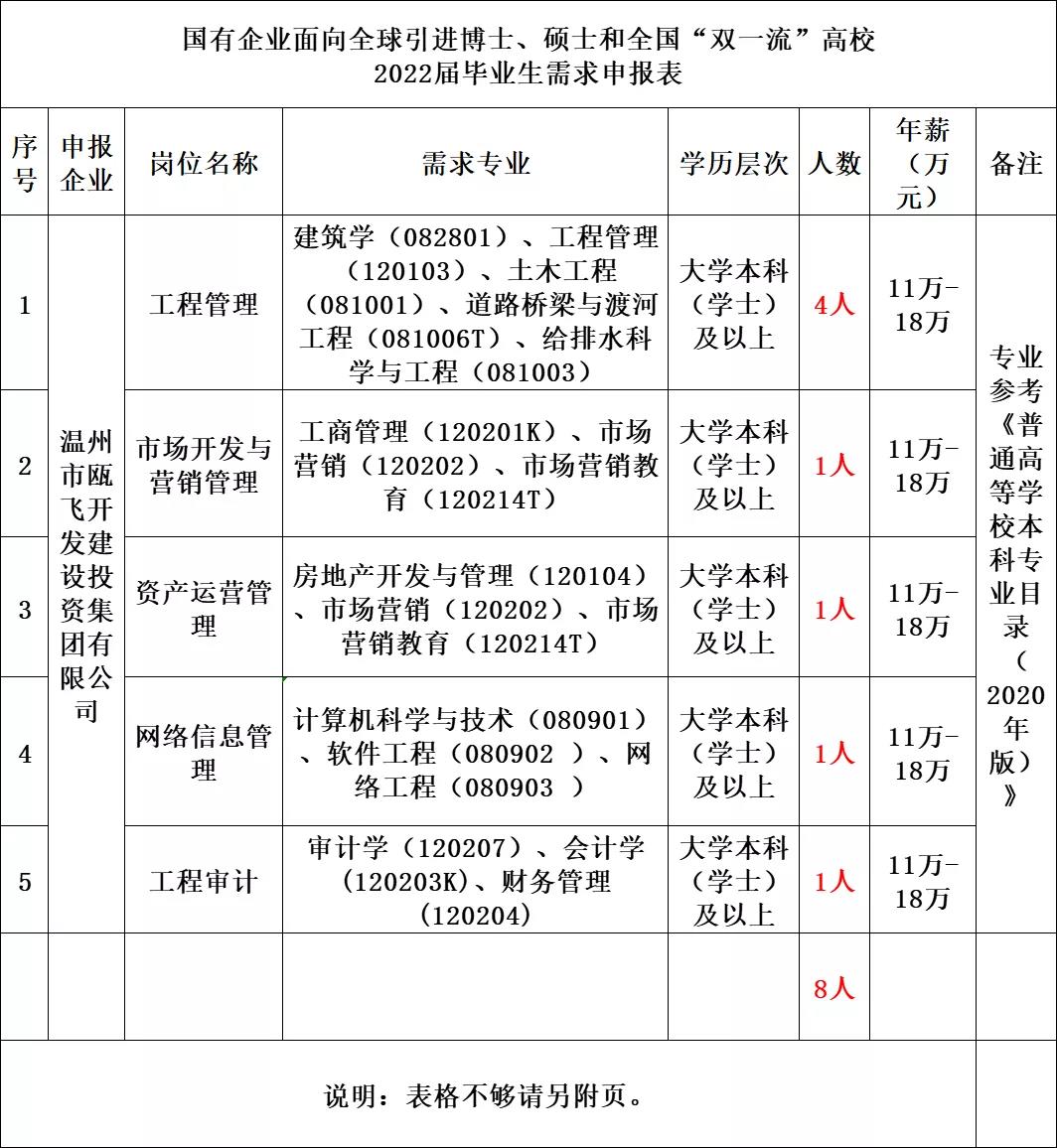 为深入推进人才强市、创新首位战略,贯彻落实市委市政府关于“百万人才聚温州”的决策部署,进一步优化企事业单位人才素质结构,引进、储备一批我市经济社会发展所需的高层次专业型优秀青年人才,为温州高质量发展建设共同富裕示范区市域样板提供有力的人才支撑和智力保障。经研究,决定开展温州市事业单位和领军企业面向全球引进录用博士、硕士研究生和全国“双一流”及部分重点高校2022届优秀本科毕业生工作点击获取职位表。现将有关事项公告如下: