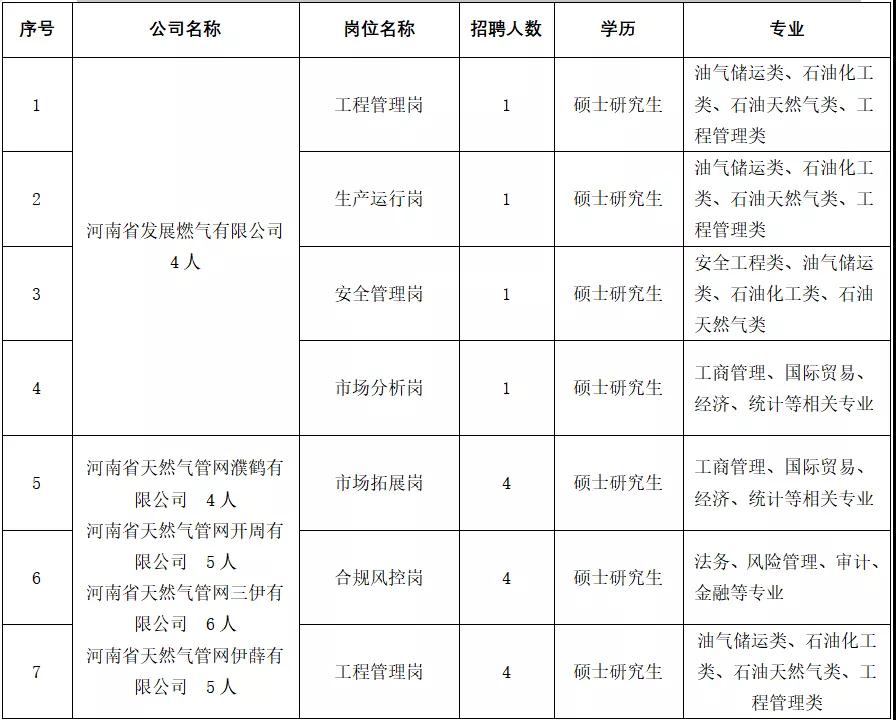 为满足战略发展需要,进一步提高公司经营管理水平,建设高素质、专业化的经营管理团队,诚邀优秀高校英才加盟河南省天然气管网有限公司,携手开创未来发展的新篇章。