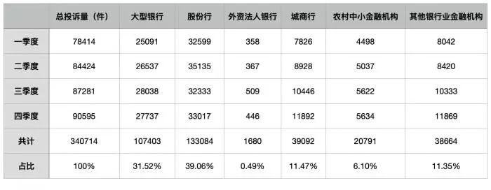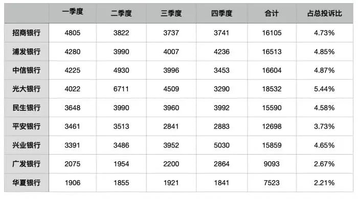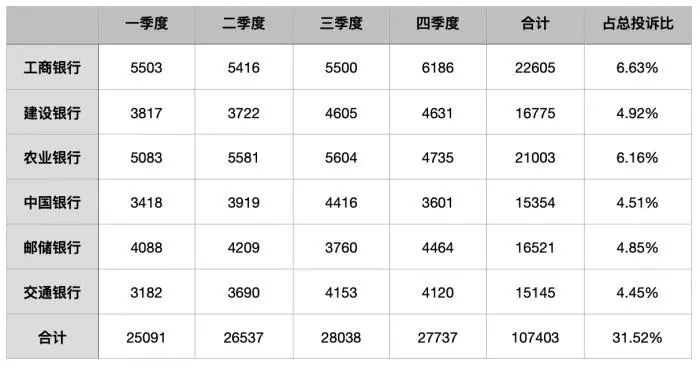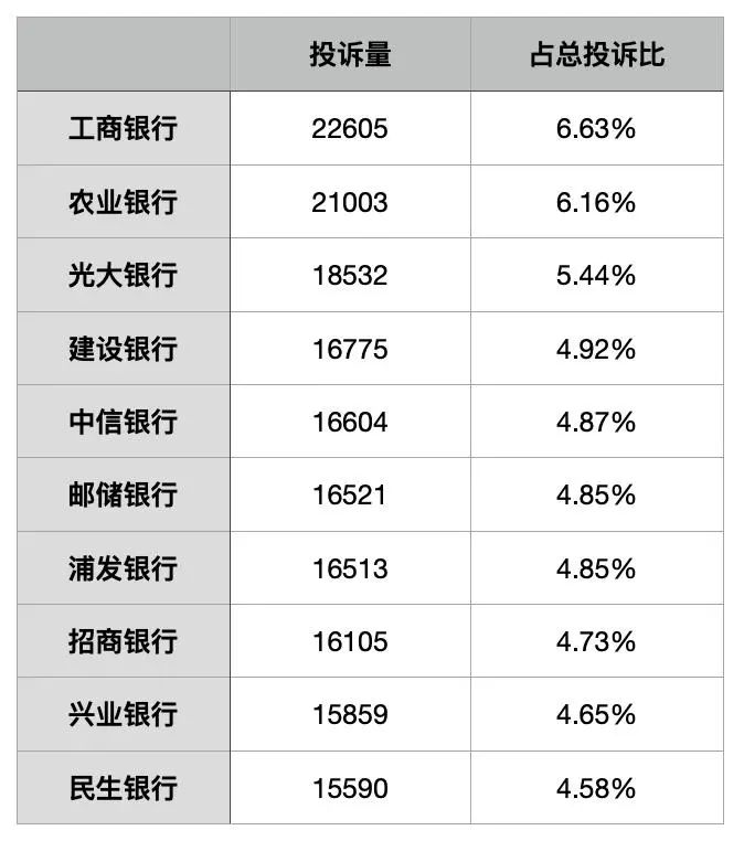 其中,工商银行、农业银行投诉量超过2万件,分别为22605件、21003件,占比分别为6.63%、6.16%;其他8家银行投诉量均超过1.5万件,占比在4.5%以上。