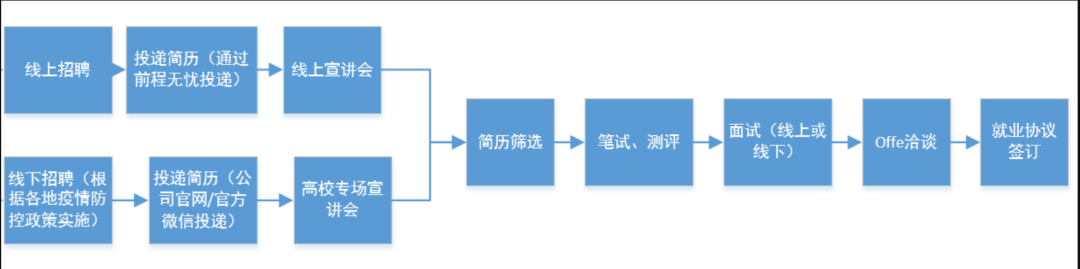 本次招聘根据疫情防控要求,同步开展线上招聘及线下招聘。本次校园招聘简历投递渠道为: