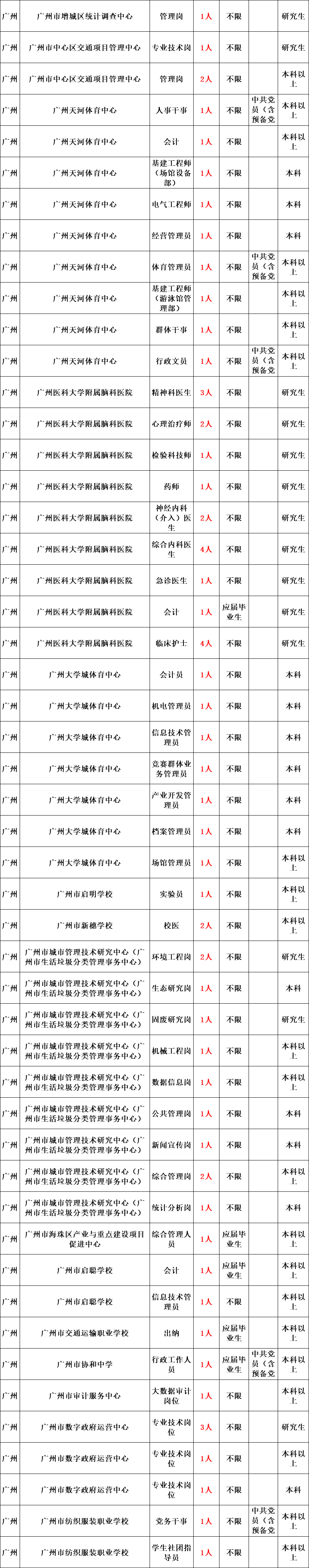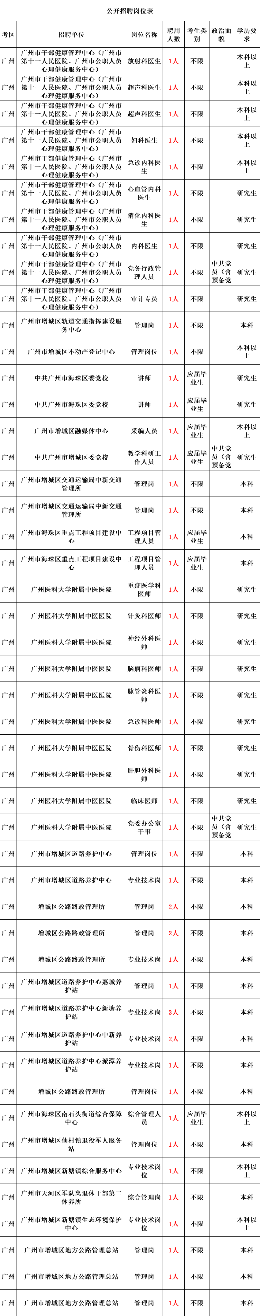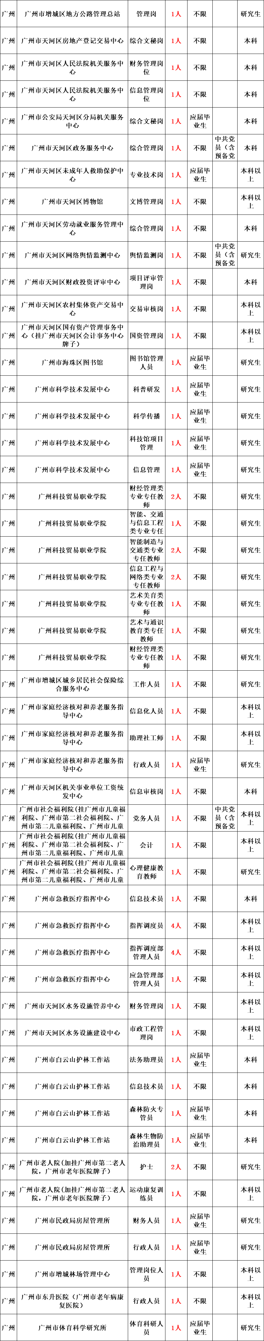 全省各级事业单位招聘工作人员14008名。报考人员可通过广东省人力资源和社会保障厅网站、广东组织工作网、广东人事考试网查阅具体的招聘单位、岗位、人数和资格条件详见职位表。