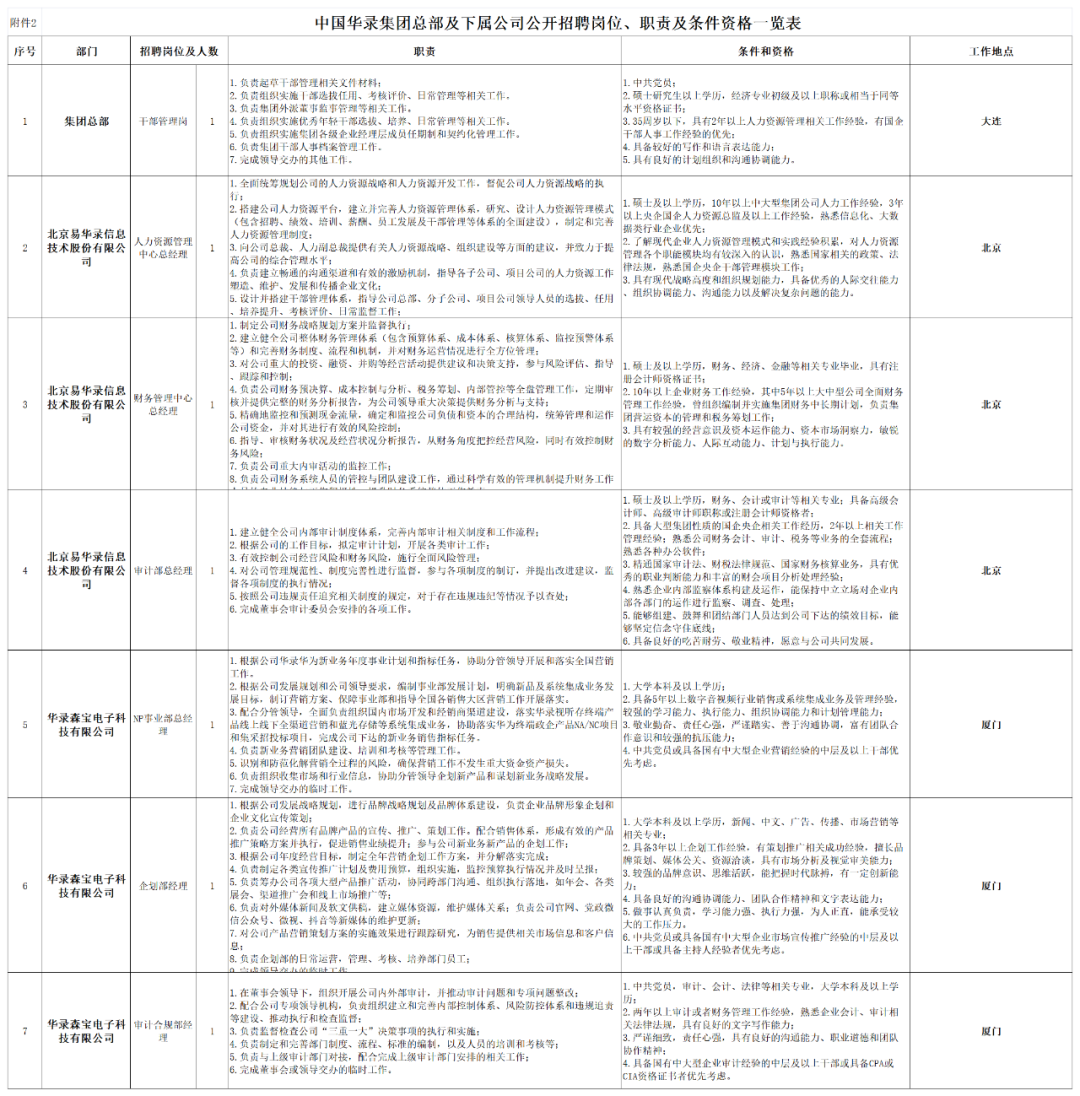 附件:中国华录集团总部及下属公司公开招聘岗位、职责及条件资格一览表