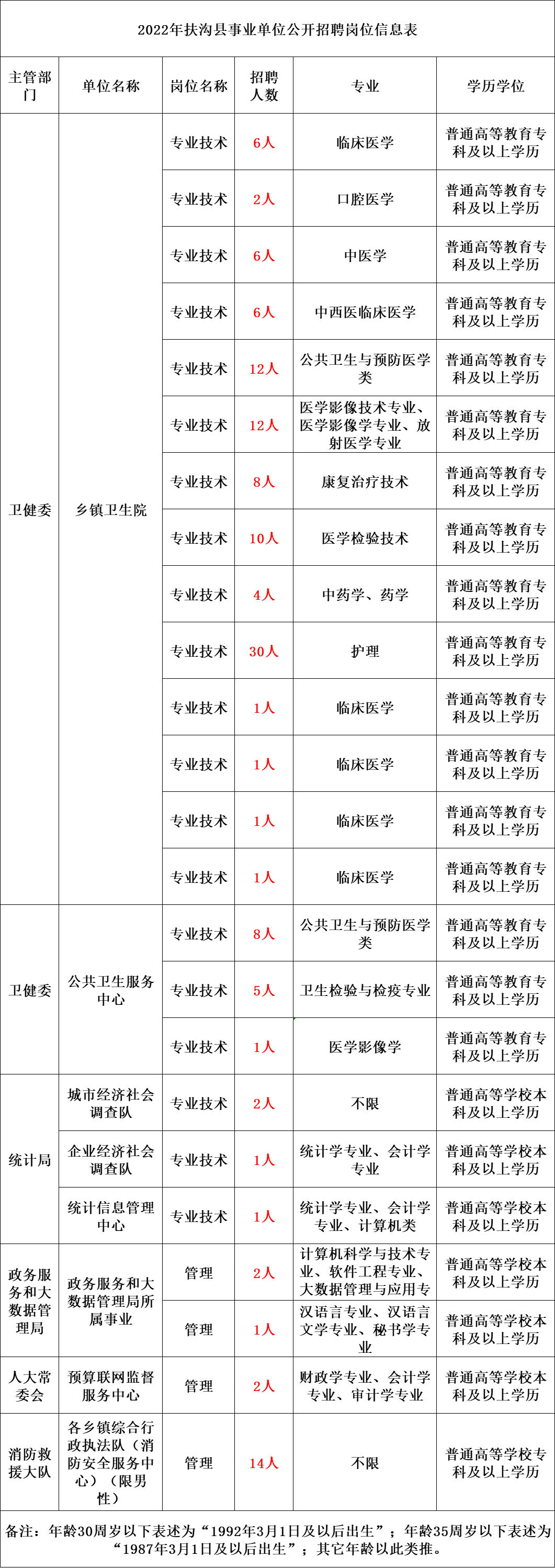本次事业单位共招聘工作人员137名,招聘单位、岗位、人数、条件等详见附件(《2022年扶沟县事业单位公开招聘岗位信息表》)。
