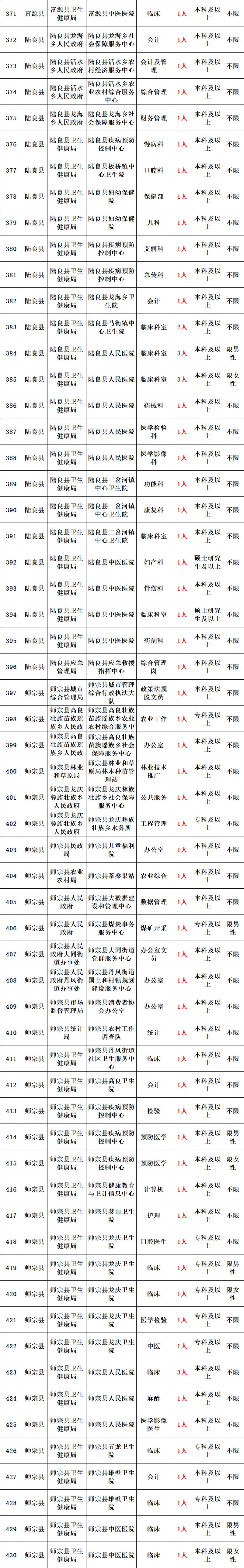 2.年龄在18周岁以上(2004年4月20日及以前出生)、35周岁以下(1987年4月20日及以后出生)。具有中职及其以上职称或技师以上任职资格或曲靖市五个脱贫县招聘乡(镇)事业单位管理人员和初级专业技术人员的,年龄可以放宽到40周岁(1982年4月20日及以后出生);具有副高职及其以上职称任职资格的,年龄可放宽到45周岁(1977年4月20日及以后出生);我市特别需要,具有副高职及其以上职称任职资格的专业技术人员,年龄可放宽到50周岁(1972年4月20日及以后出生)。招聘岗位是否放宽年龄条件,由用人单位和主管部门确定,详见招聘计划表。