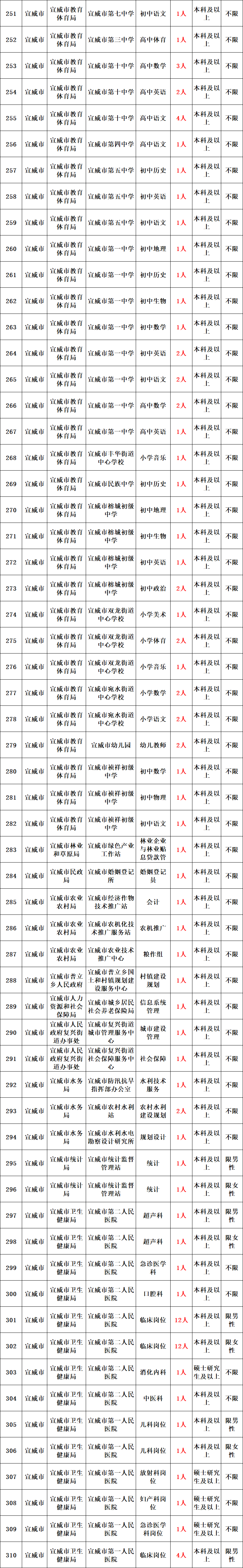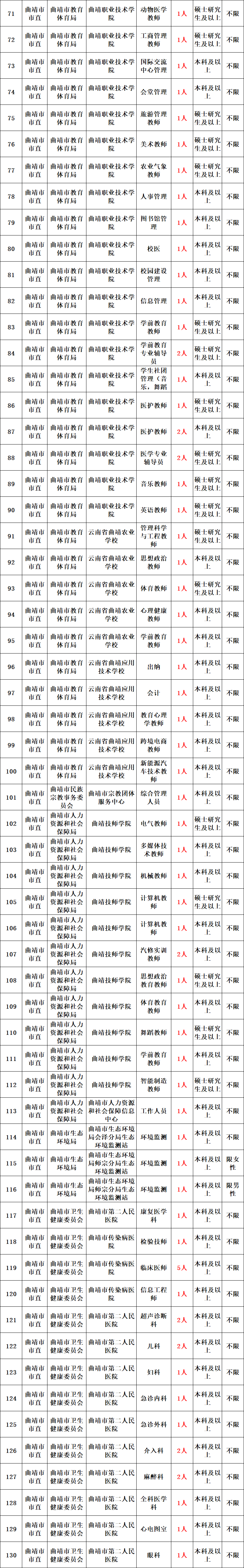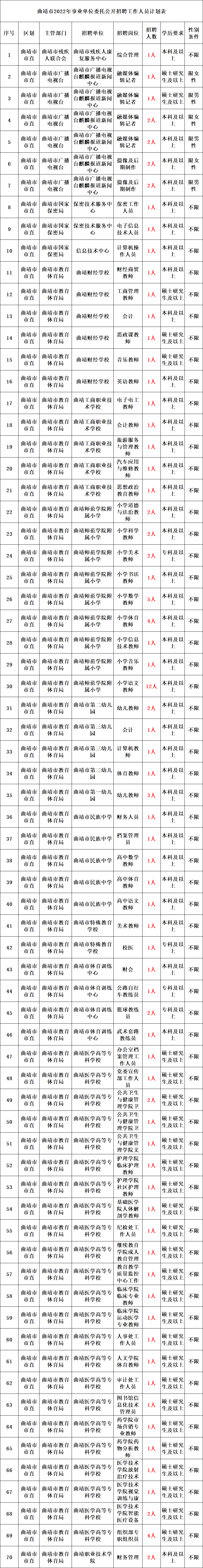 曲靖市2022年各级各类事业单位计划委托公开招聘工作人员共674人,其中:市直事业单位249人、各县(市、区)425人(麒麟区23人、沾益区10人、马龙区19人、宣威市214人、陆良县30人、师宗县56人、罗平县44人、富源县29人)。具体招聘岗位及招聘条件详见《曲靖市2022年事业单位委托公开招聘工作人员计划表》(以下简称“招聘计划表”)。