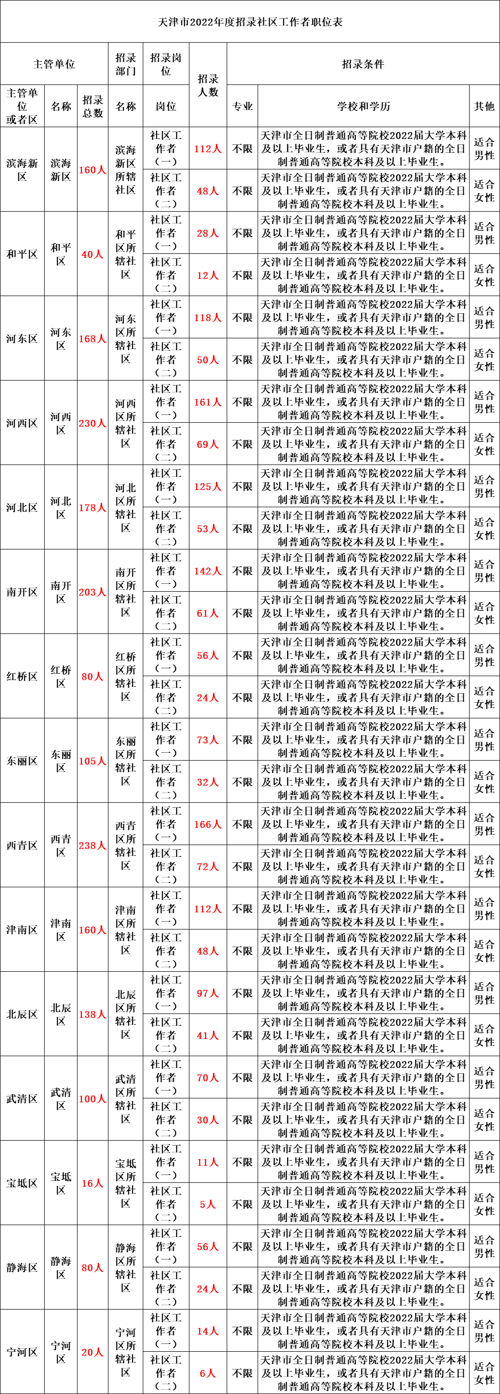2022年,天津市计划招录社区工作者1916名,其中滨海新区160名、和平区40名、河东区168名、河西区230名、河北区178名、南开区203名、红桥区80名、东丽区105名、西青区238名、津南区160名、北辰区138名、武清区100名、宝坻区16名、静海区80名、宁河区20名,统筹安排到所辖社区工作