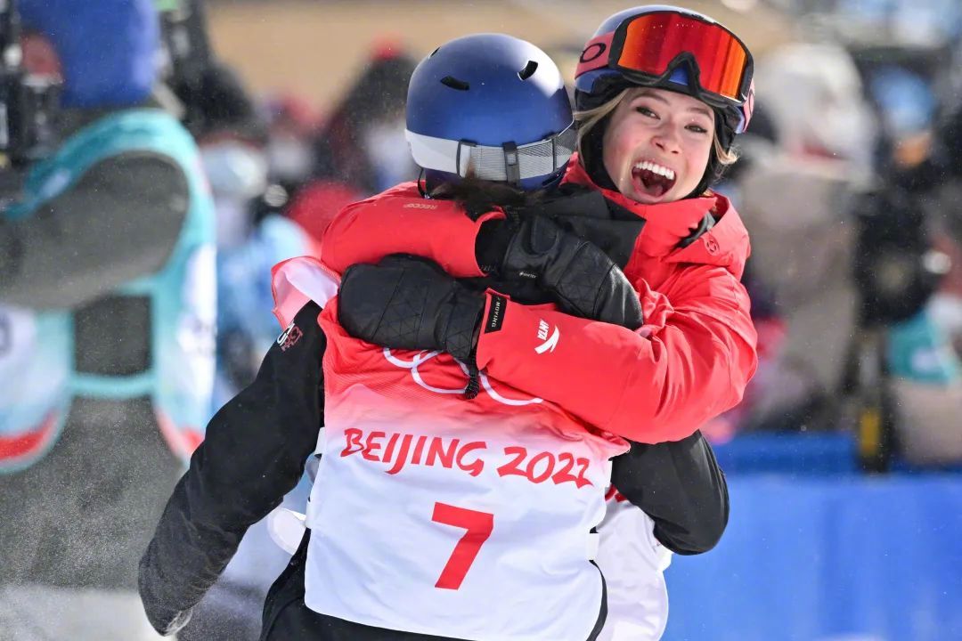 2月15日,张家口,2022北京冬奥会自由式滑雪女子坡面障碍技巧决赛结束后,中国选手谷爱凌(右)与冠军瑞士选手玛蒂尔德·格雷莫德拥抱