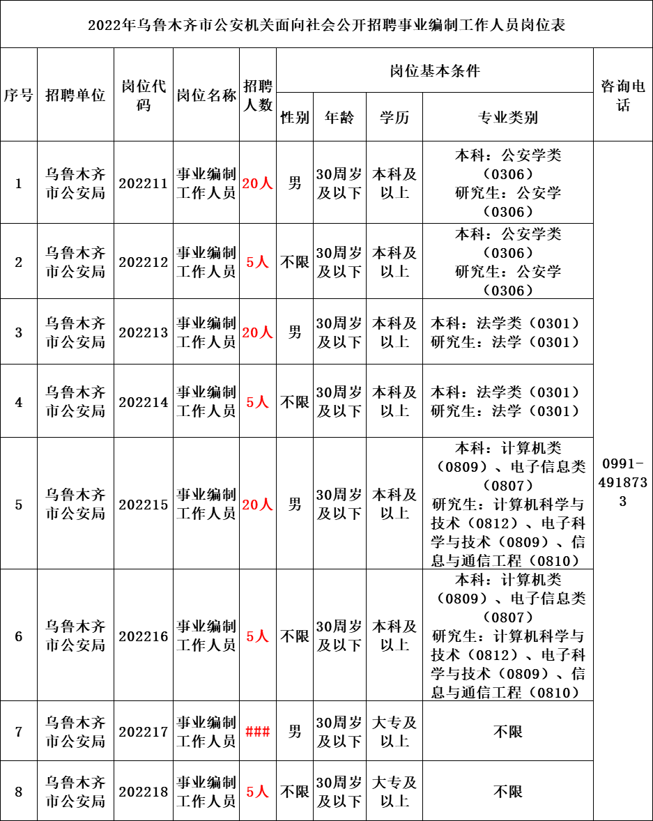 计划招聘事业编制工作人员200名,具体岗位详见《2022年乌鲁木齐市公安机关面向社会公开招聘事业编制工作人员岗位表》(以下简称《岗位表》)。