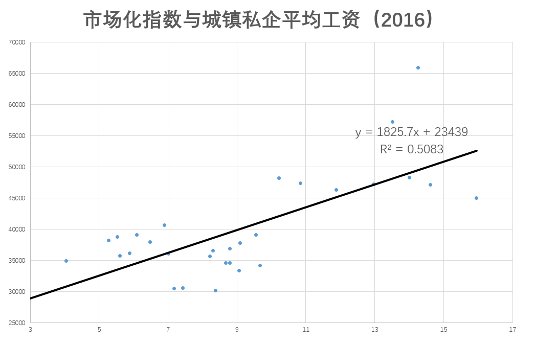 此外,张维迎等学者的研究还显示,市场化程度越高、民营经济越发达的地方,私人企业员工平均工资越高。仍以2016年为例,市场化程度每提高一个点,私人企业员工的平均工资可以上涨1826元。